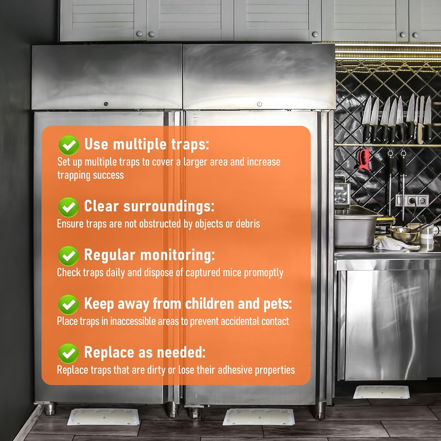 - Pest and Mouse Sticky Traps: sticky traps for mice can catch not only mice but also other common pests in your home, and we suggest you position sticky traps along active rodent runways, such as along walls, under large kitchen appliances, in cupboards, and other areas where rodents travel, be sure to fit the glue trap flush against a wall where rodents will run over and stick to it; And cold weather Qualirey glue traps for mice and rats can withstand 0Β° Fahrenheit weather