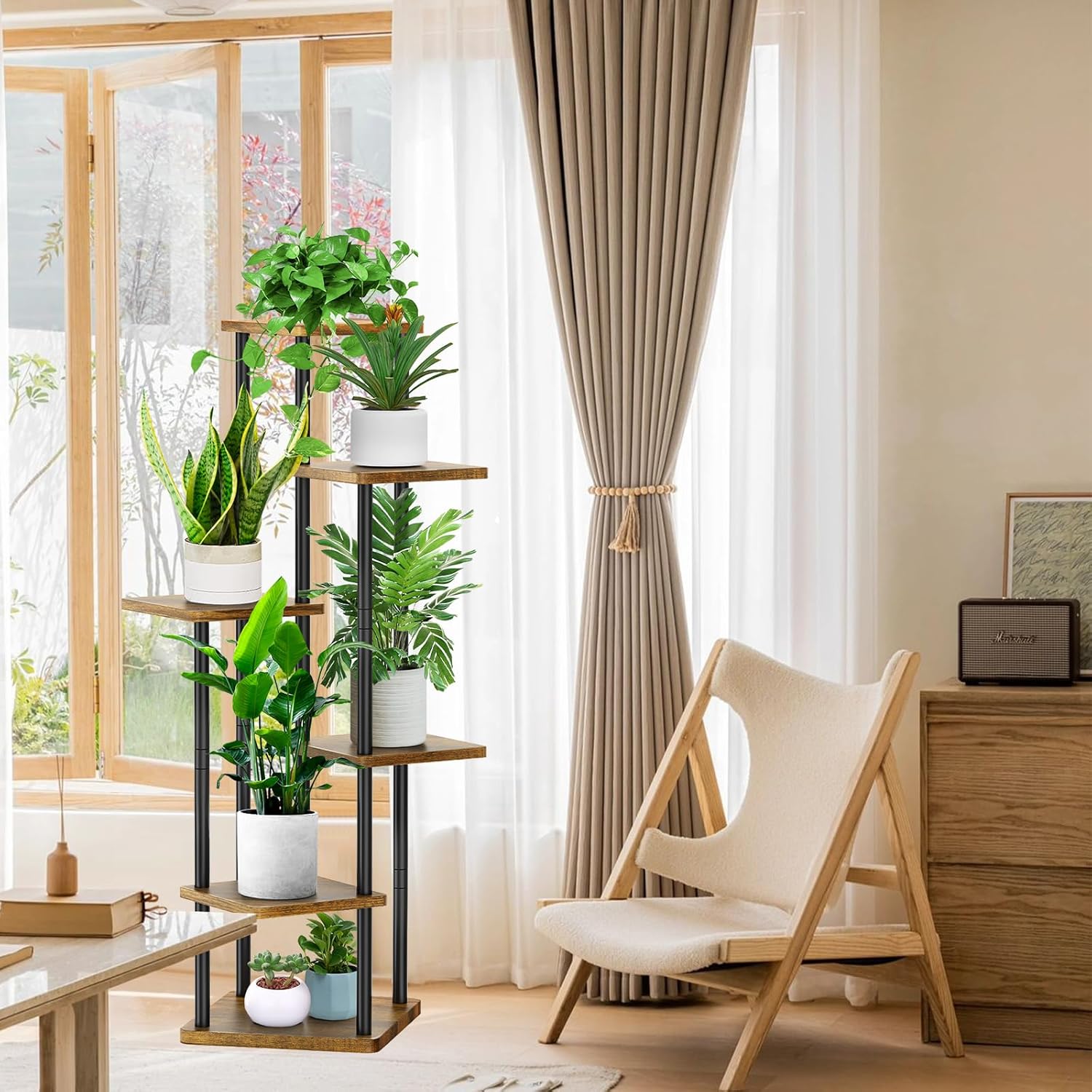 6 Tier Wood Tall Plant Stand Metal Rack Indoor, Multiple Flower Pot Holder Shelves Corner Rack, Planter Shelf Display Rack Storage Organizer for Patio Living Room Balcony Garden(Black)