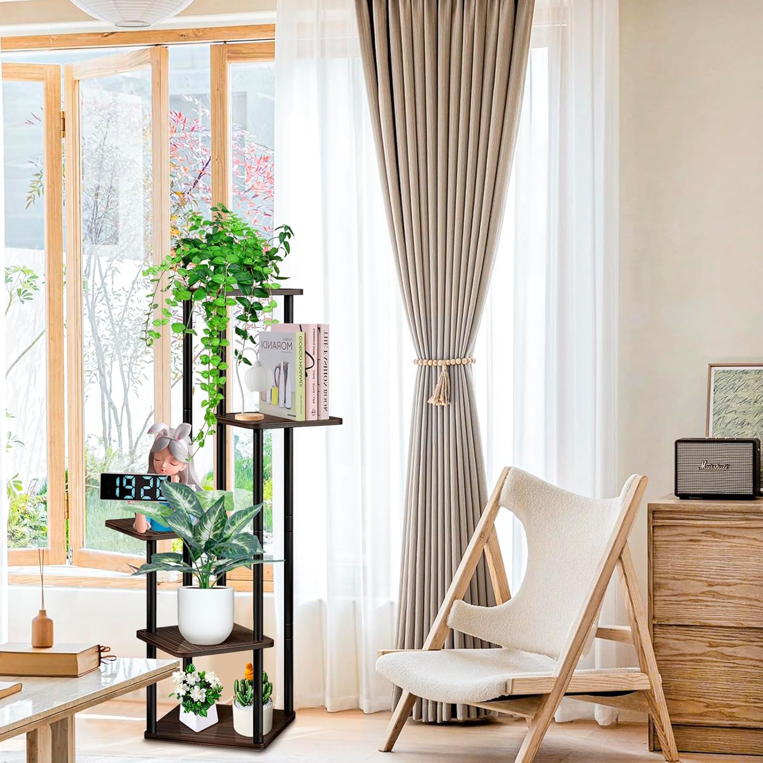 - 【Elegant Decoration & Space Saver】Minimalist style, wood grain board with metal frame, Vintage Plants Stands Rack match well with your home decor in living room, corner, balcony, hallway, garden, patios etc.