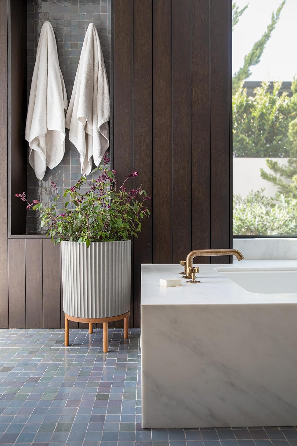 Veradek Demi Series Round Planter w/Stand for Porch/Patio | Durable Plastic-Stone Composite & Wooden Stand | Modern Décor for Tall Plants, Flowers