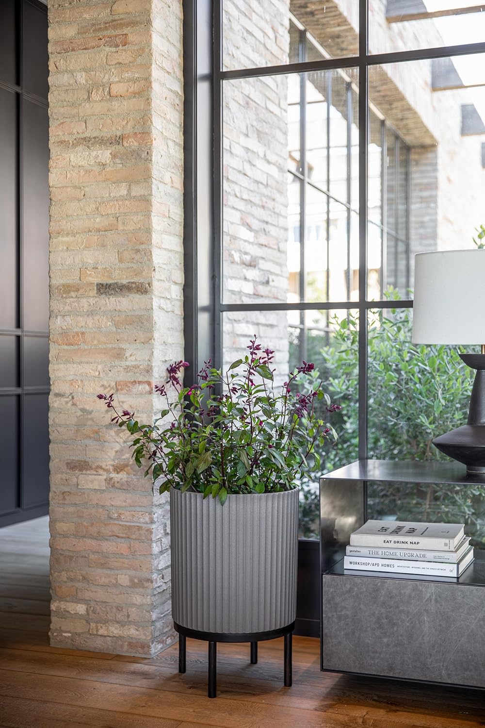 Veradek Demi Series Round Planter w/Stand for Porch/Patio | Durable Plastic-Stone Composite & Wooden Stand | Modern Décor for Tall Plants, Flowers