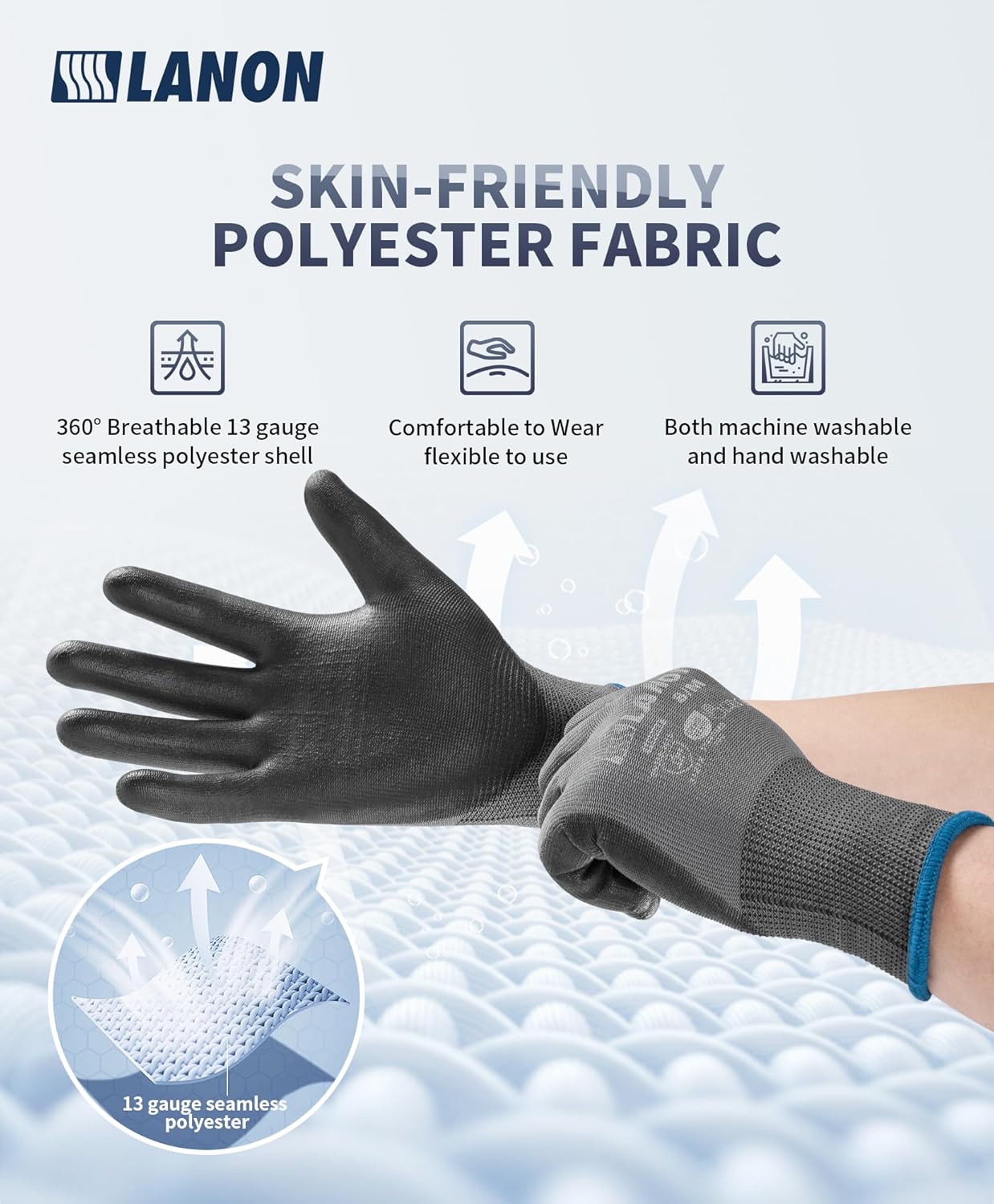 LANON 18 Pairs Safety Work Gloves, Mechanic Working Gloves for Men,Breathable PU Coated, Seamless Knit,Double Wash, Grey, Medium