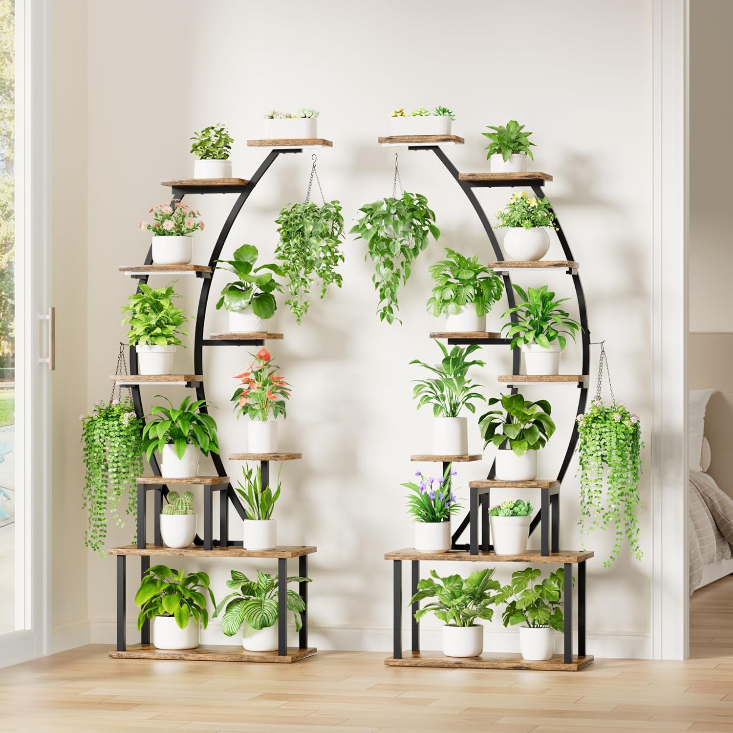 - 【9-Tier, 64" Elevated Plant Stand】 This 64" plant rack with increased height features 9 tiers, 18 pot stands, and 4 hanging hooks, providing you with ample storage space to display plants as much as possible. In addition, it can also serve as a display shelf for placing books, pictures, collectibles, awards, small ornaments, artworks, crafts, and more. This tall plant stand will be a creative addition to your home decor.