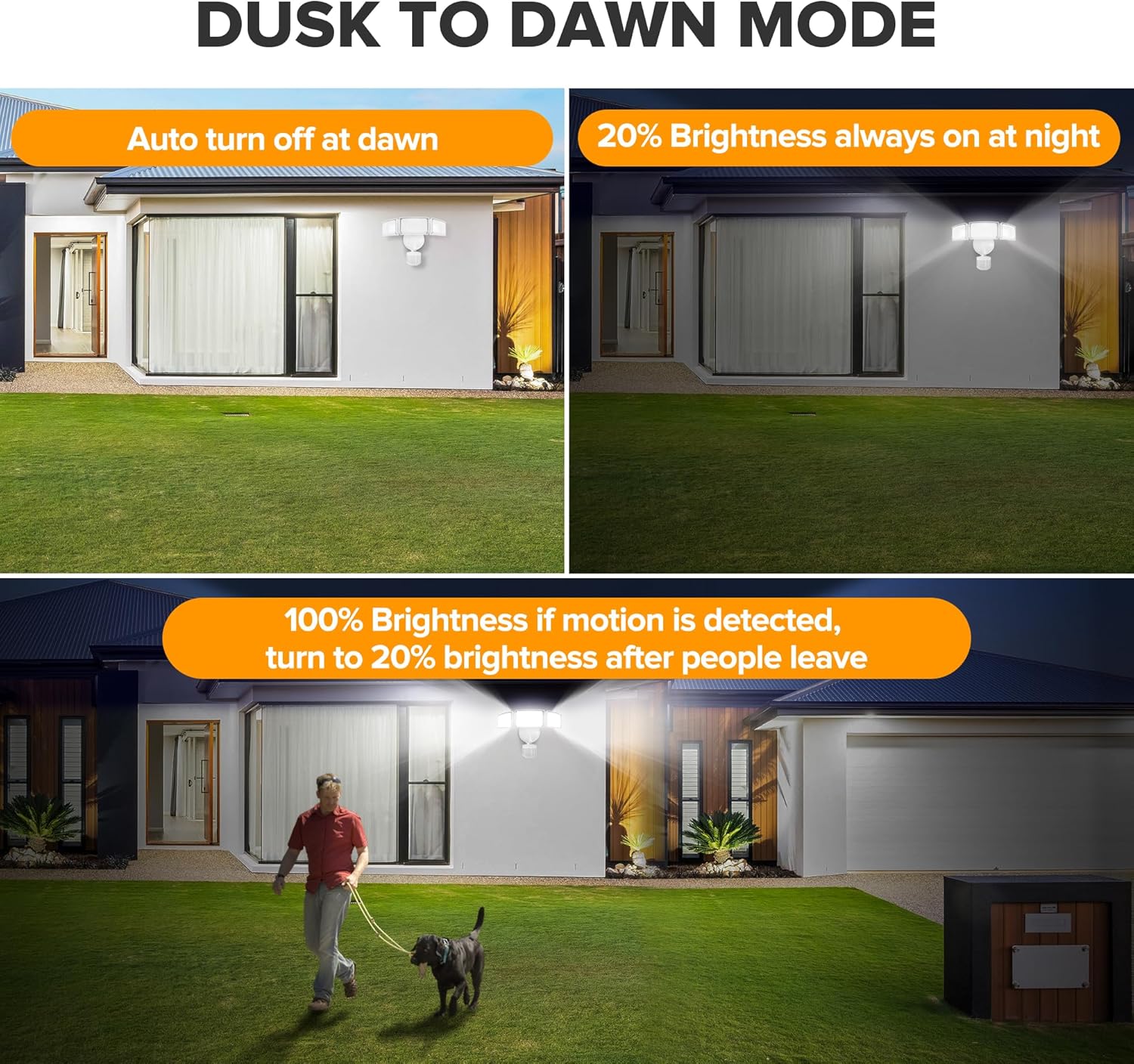 - 4 Lighting Modes: The motion sensor outdoor lights has 4 lighting modes: Test Mode, Security Mode, Dusk to Dawn Mode and Manual Override Mode. Different lighting way for your various usage requirements, suitable for the porch, garage, driveway, swimming pools, etc