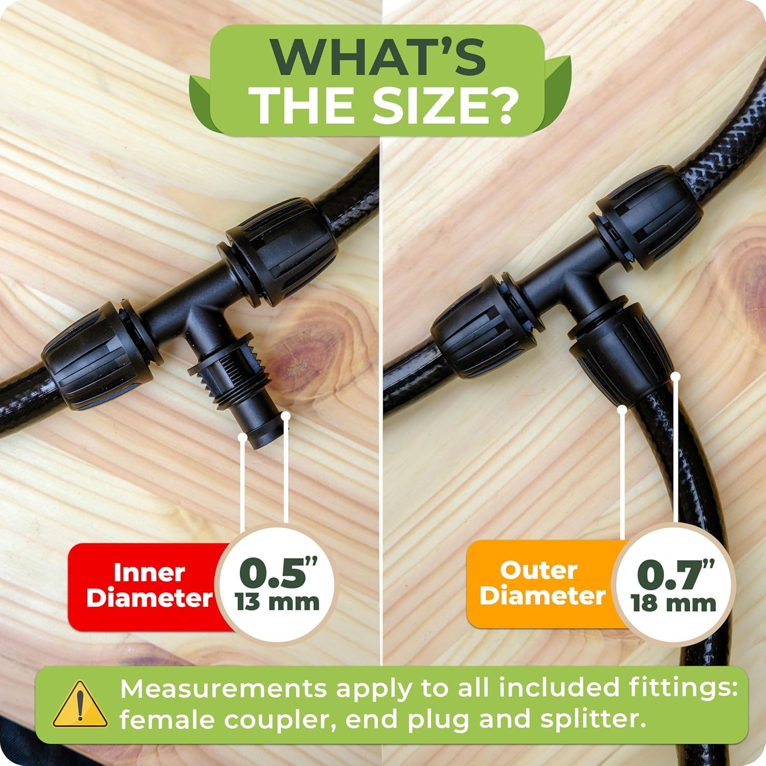 - Enjoy taking care of your garden with high-quality drip irrigation system parts that are easy to install. Simply cut the 1/2 inch drip irrigation tubing into your desired length and connect it to the tubing splitter 3 way and split your mainline as you wish. Our 1/2 inch drip irrigation fittings are the perfect fit for a plant watering system. Make gardening less of a chore