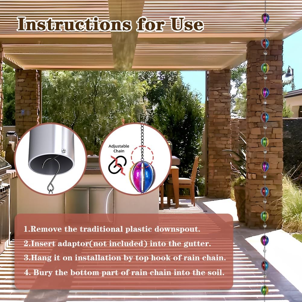 - Unique Design: The rain chain is designed with colorful hot air balloons shape, hanging on the gutter of the eaves, it can not only effectively guide the flow of rainwater, but also decorate the eaves and bringing different visual effects