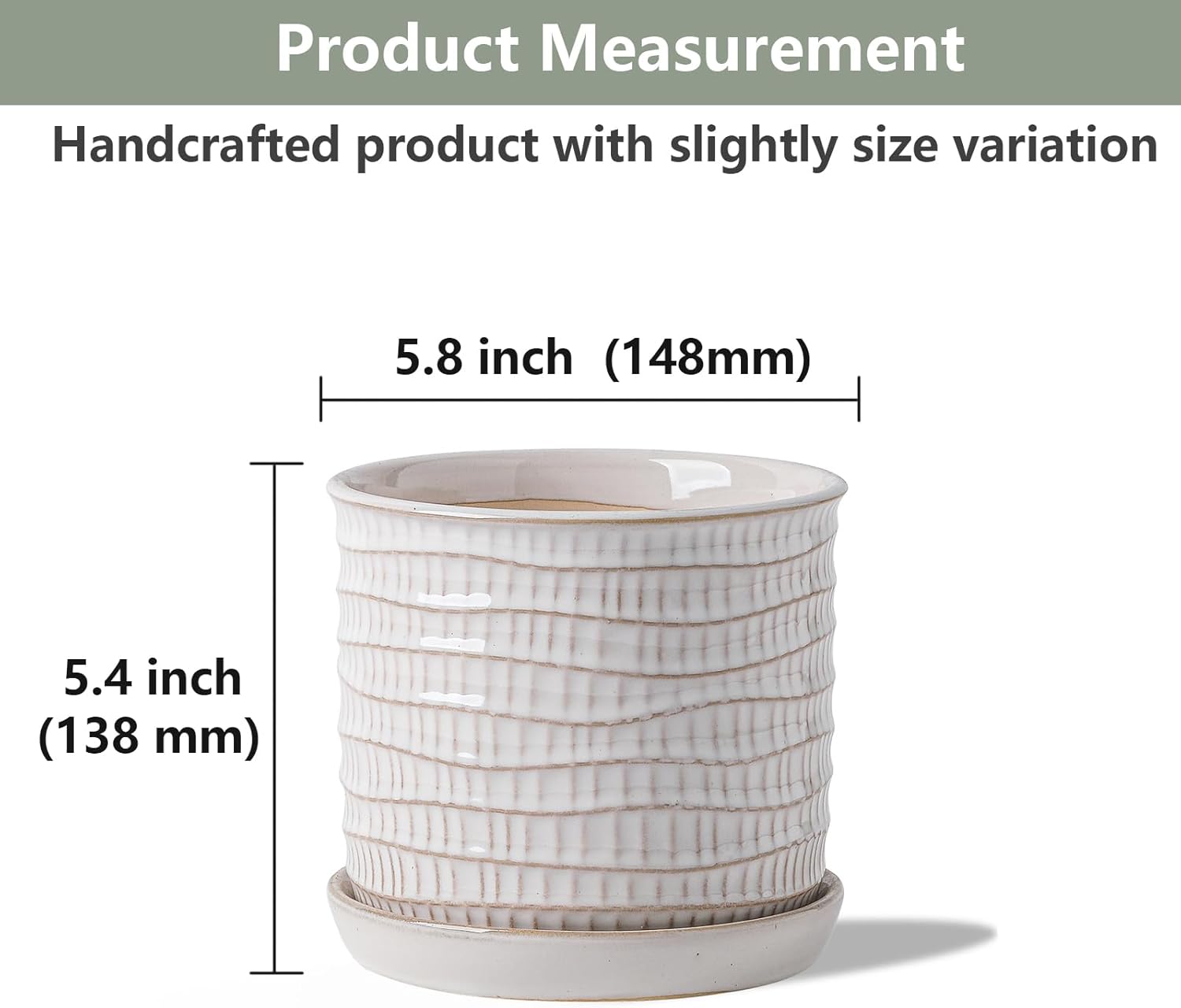 5.8 Inch Plant Pot: Ceramic Planter with Drainage Hole & Saucer - Cream White Flowerpot for Indoor & Outdoor Plants - with Separate Tray for Home & Office - Wave Embossed Design