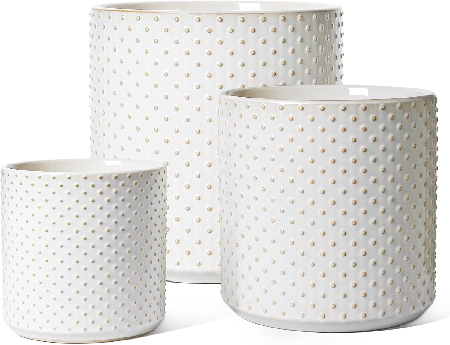 LE TAUCI Ceramic Plant Pots Indoor, 10+8+6 Inch Planters for Indoor Plants, Raised Dots Flower Pots with Drainage Hole and Plug, Cylinder Round Planters, Set of 3, Glaze Arctic White