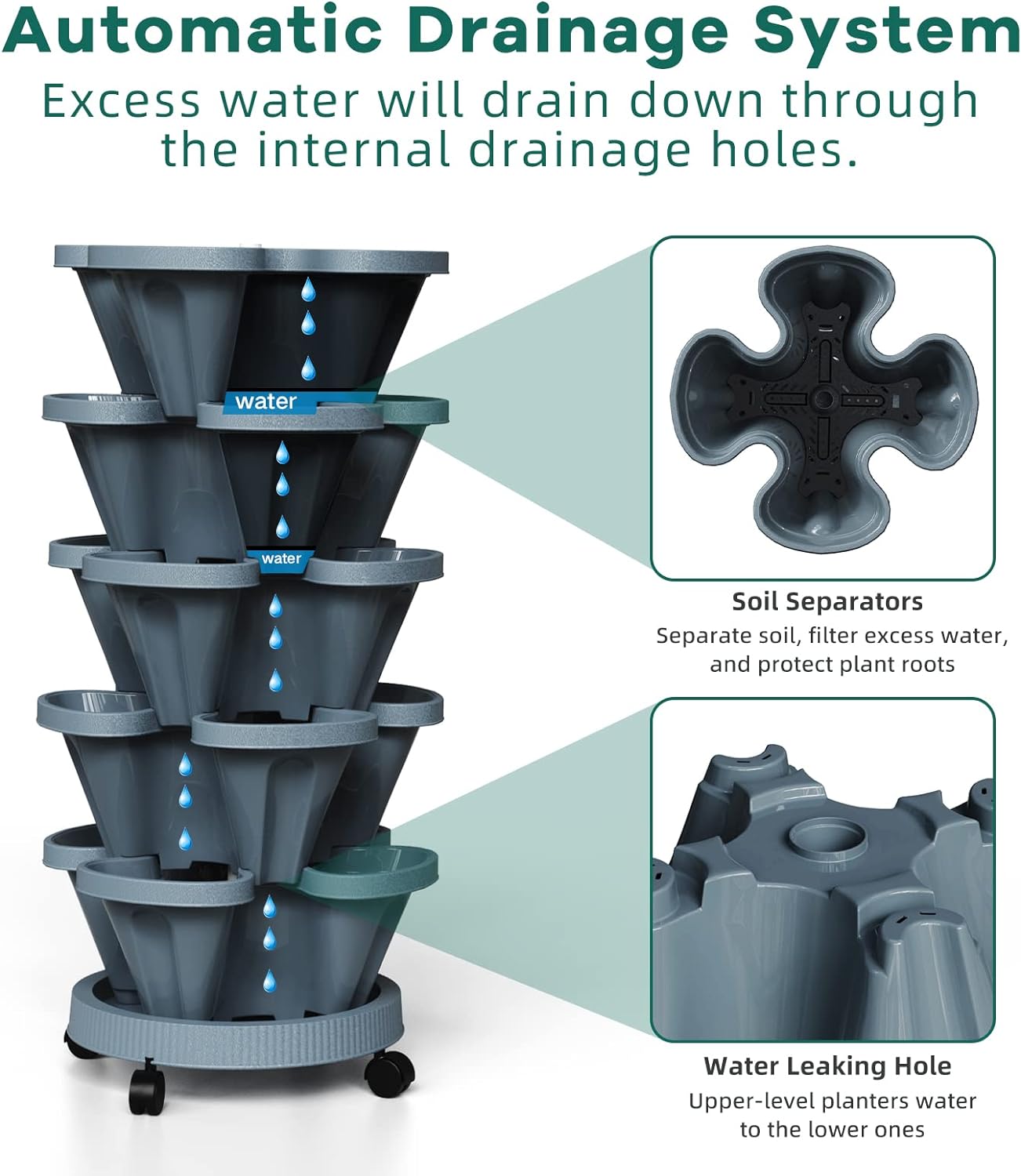 - Flow Design - The water filtration system from top to bottom can save water and retain moisture but prevents overwatering or root rot. 6 filters are placed on each level to keep the soil from going through the big drainage holes, it also helps retain water in each planter level.