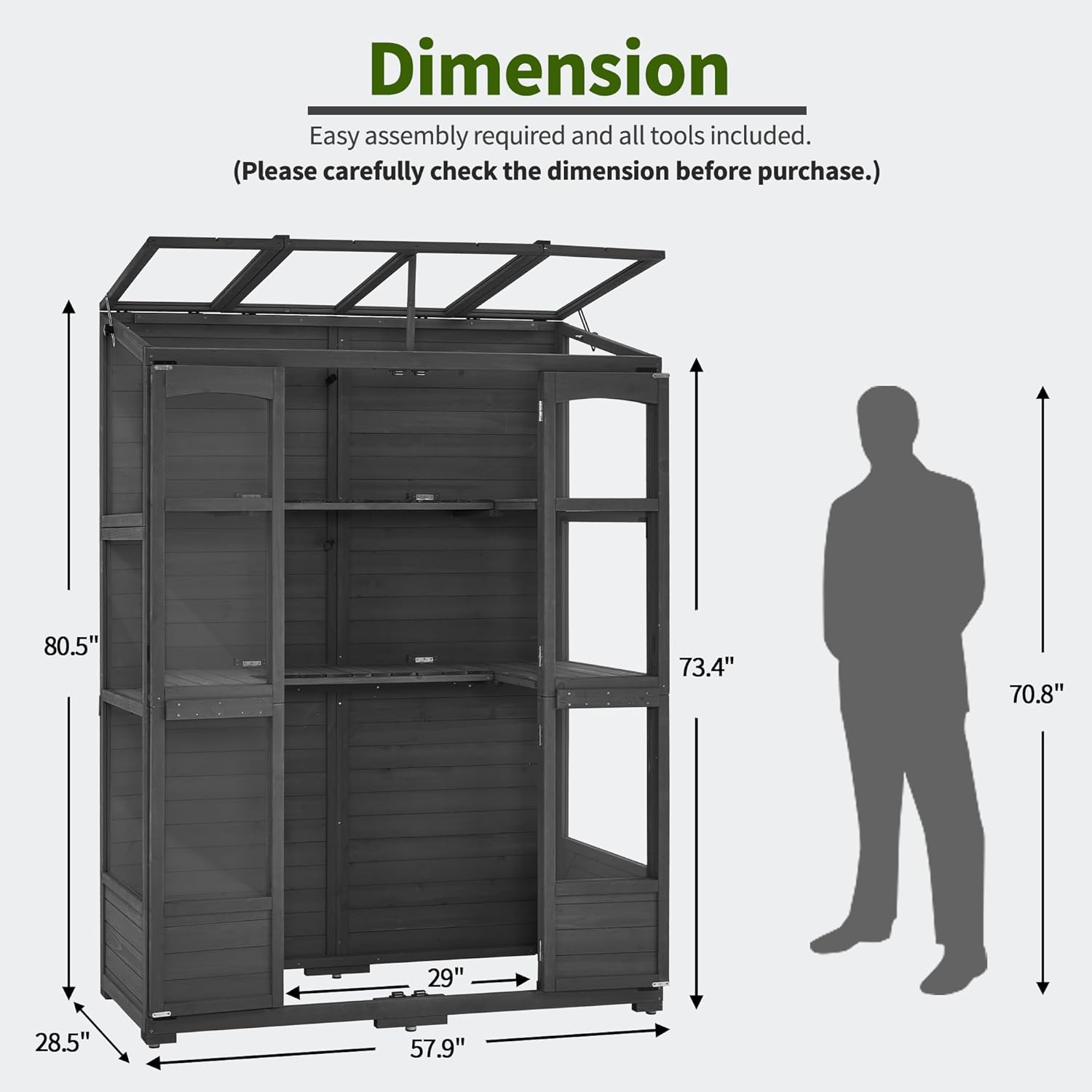 - Fir Wood: The wooden greenhouse is made of high-quality pure fir wood, and the exterior has been polished to express a rustic style. Medium brown blends easily with other dรฉcor and natural settings