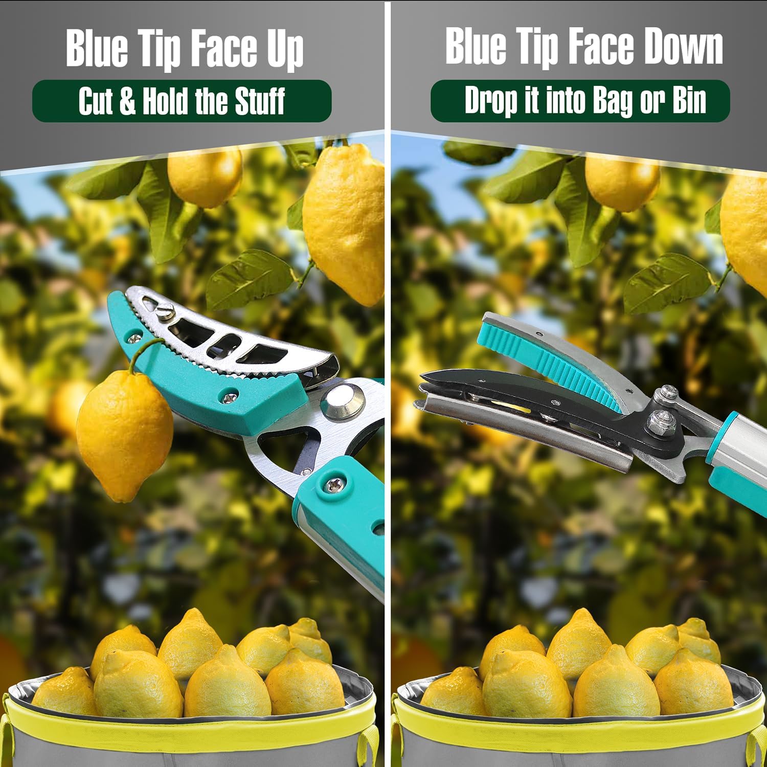 - 【 Cut and Hold Pruner】- Cleaning Up is No More a Two-Step Process! This telescopic long reach pruner comes with wavy tip, which holds your soft fruits firmly without falling when facing up & drop the cuttings right into bins when facing down. Hardened sharp blade makes non-stick clean cuts and sures long-lasting use