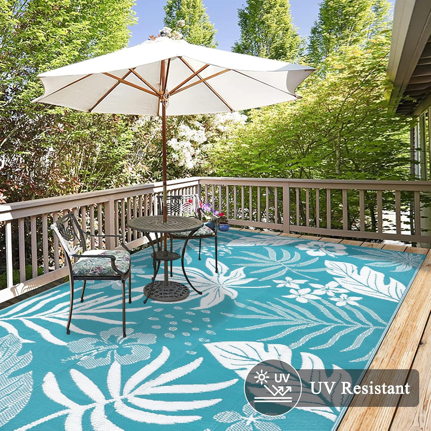 Pauwer Waterproof Outdoor Rug 6x9, Reversible Plastic Straw Patio Camping Rug, Indoor Outdoor RV Mat Carpet for Deck, Camper, Porch, Balcony, Backyard, Picnic, Floral Teal