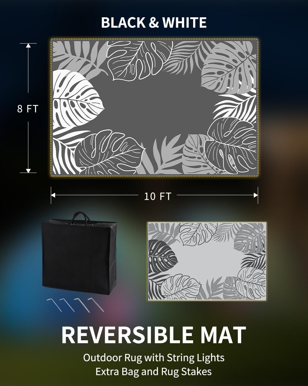 - RV traval&Camping: This camper must haves outdoor rug is ideal for picnics, gatherings, and RV trips! The lightweight outdoor camping carpet with foldable lines is easy to carry and saves space. Includes an extra carry bag and rug stakes for 6x9 ft, 8x10 ft and 9x12 ft. Grass-friendly, durable, and easy to clean, this outdoor rug enhances outdoor adventures.