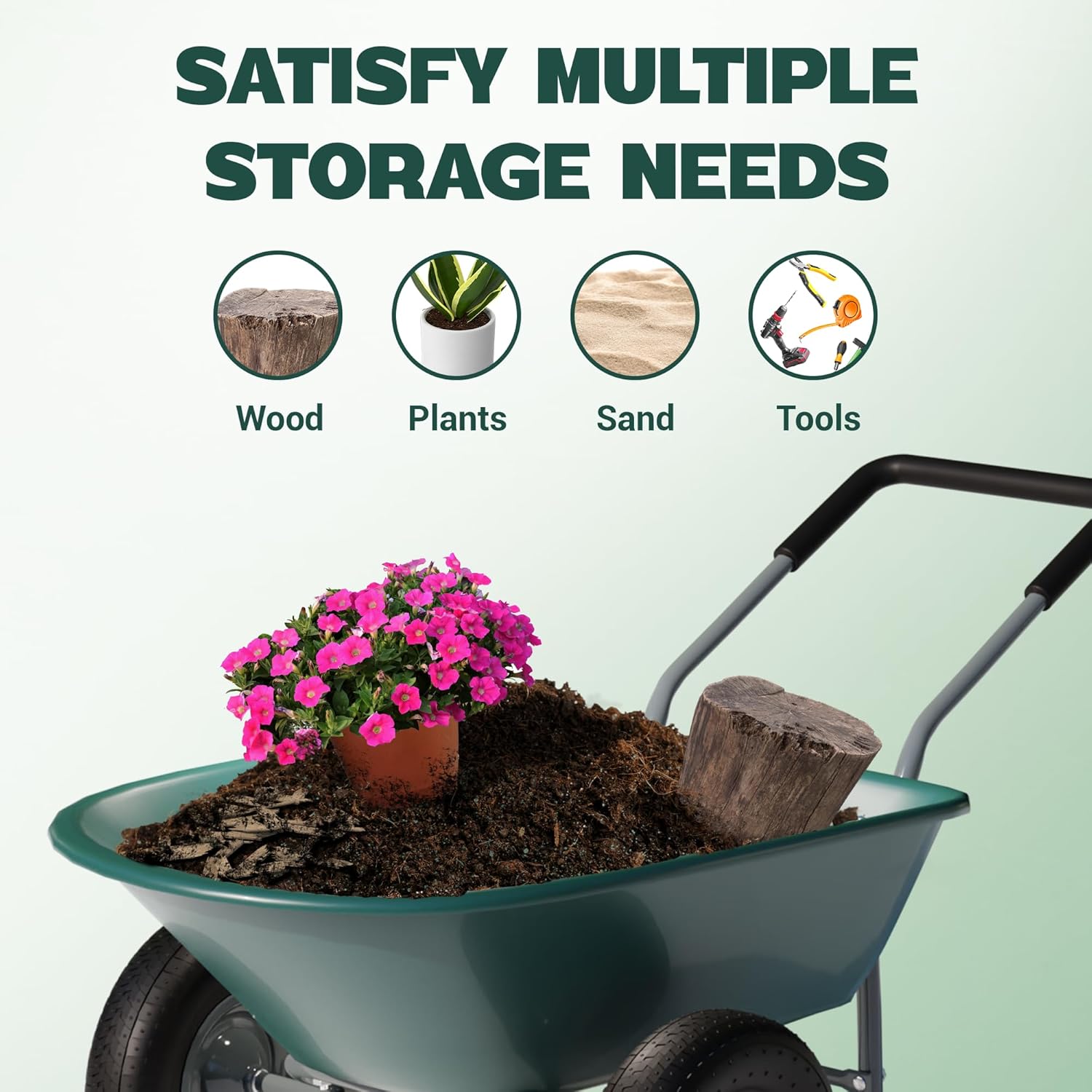 - STABLE DUAL WHEEL WHEELBARROW: The 2-wheel wheelbarrow ensures even weight distribution for a smooth, controlled ride; With 14-inch pneumatic tires, navigating uneven terrain becomes effortless, making the utility wagon ideal for any task