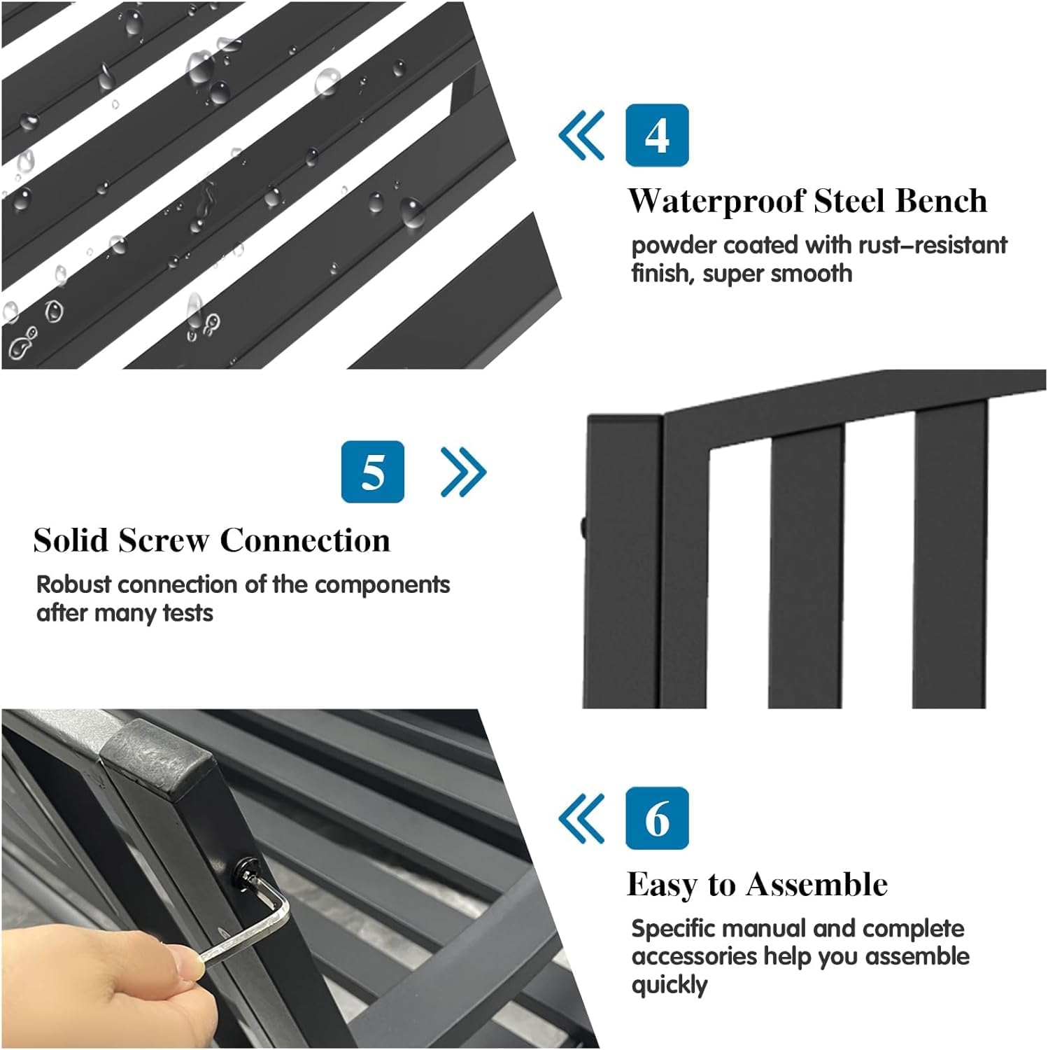 - ăDurable Steel ConstructionăUnlike easily deformed wood, this whole outdoor garden bench made of reinforced iron to ensure sturdiness and stability for long-term use. The patio garden bench is crafted of multiple anti-rust powder coated treatments, increase weatherproof protection. The advanced spray tech created matte frosted texture surface bring you a smooth touch.
