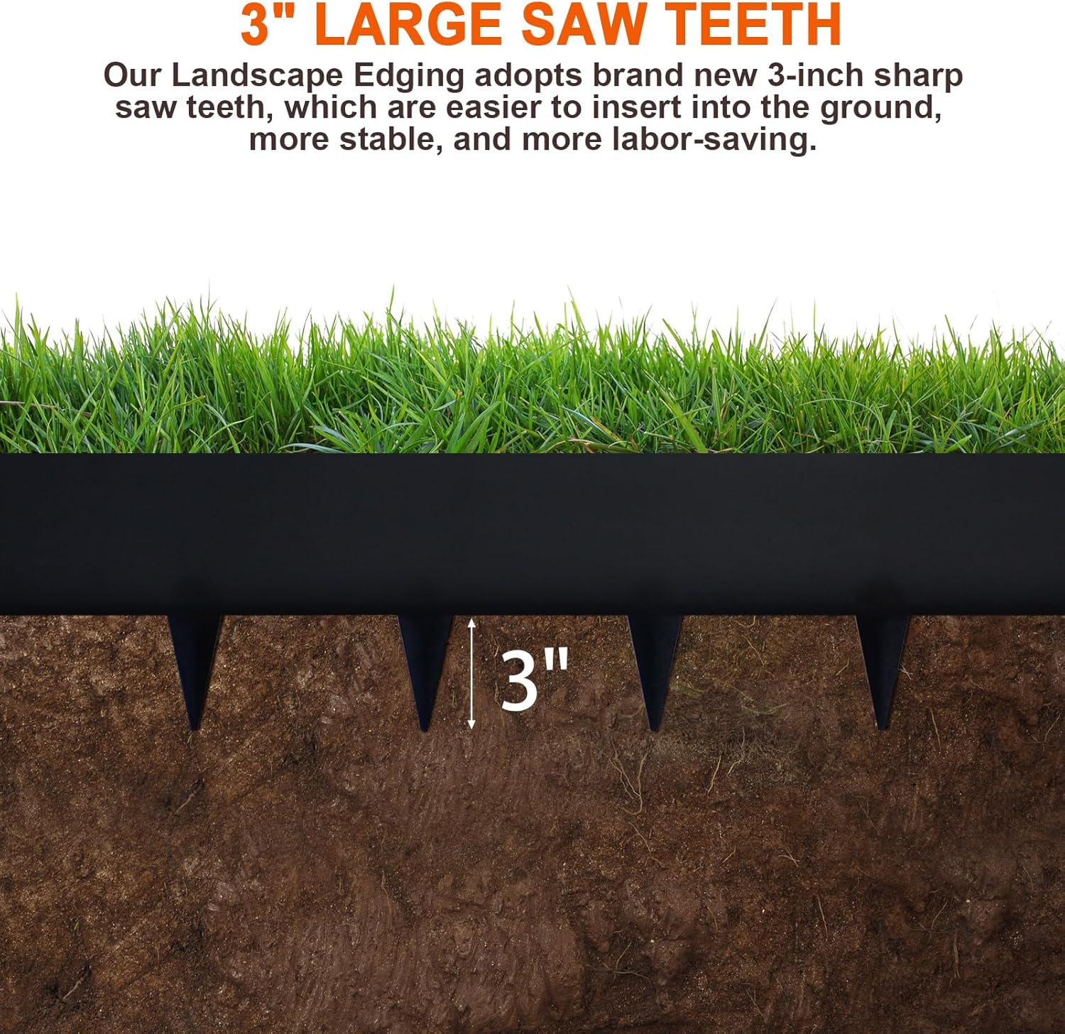 - [3" Large Saw Teeth] - Our Steel Landscape Edging adopts brand new 3-inch sharp saw teeth, the no-dig design, along with the included clips, which are easier to insert into the ground. The 6-inch depth is perfect for keeping mulch and soil in place while preventing grass from encroaching into your flower beds