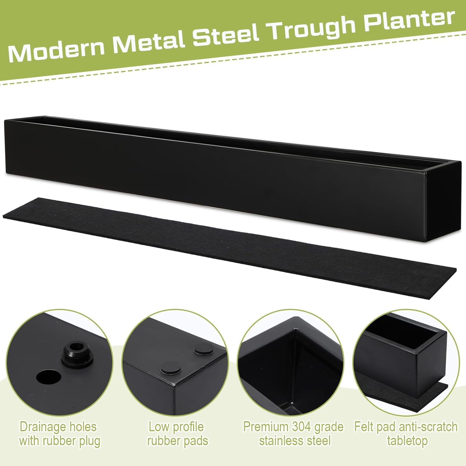- Quality Materials: our exquisite stainless steel metal planter is made of reliable grade 304 stainless steel and is thick enough to ensure that the flowerpots are long but not deformed; The edges are seam welded to ensure that your narrow box is waterproof, and the steel of the box is powder coated; This coating ensures that your flower box is scratch resistant and will not chip or fade; Rubber pads are also provided for added stability; Not including plants and rocks