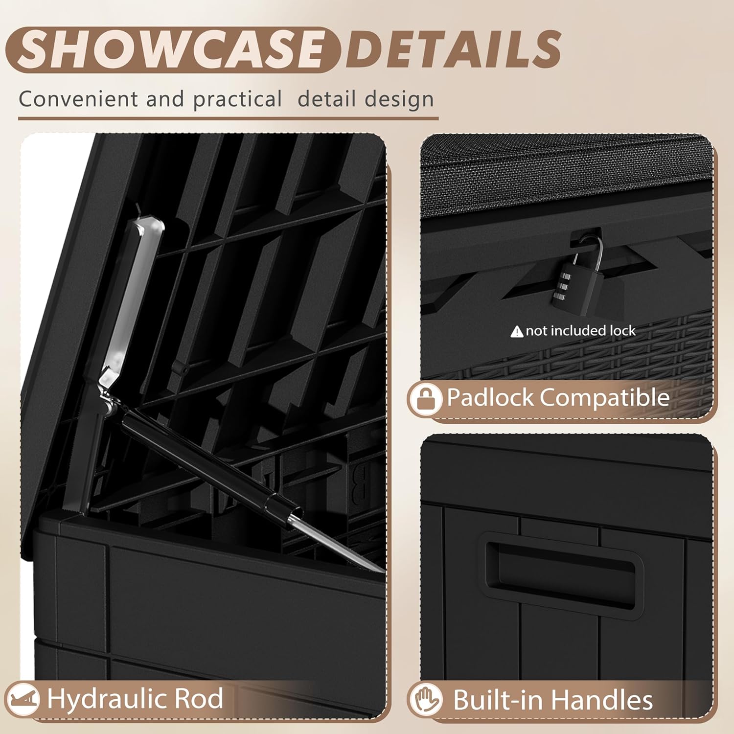 • Durable Resin Material: Deck box is made of waterproof resin, with a complementing rattan pattern design, effectively preventing fading and rusting, while also maintaining a fresh appearance even with all-weather use