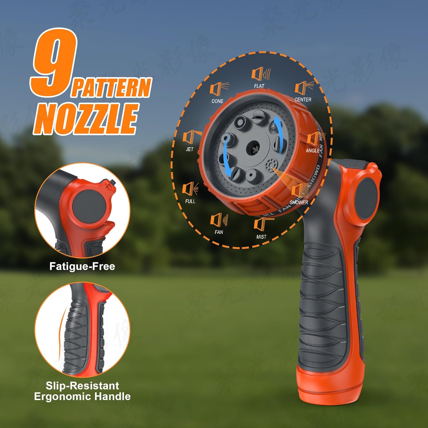 - 【9-Pattern Pro Nozzle】Professional garden hose sprayer with upgraded pressure control delivers 9 targeted modes (Flat/Cone/Jet/Full/Fan/Mist/Shower/Angle/Center).The hose nozzle has been upgraded, allowing you to adjust the water pressure by simply pushing the switch.
