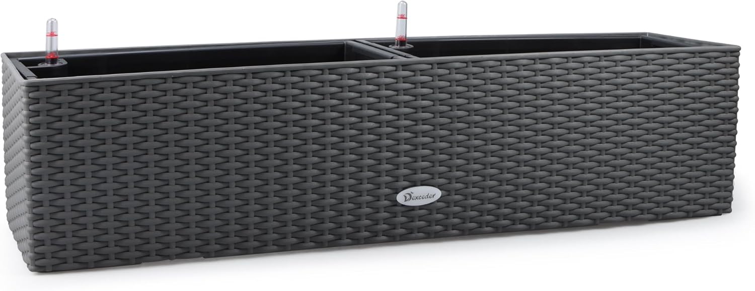 Dexceder 31.5 Inch Rattan Self Watering Planter Indoor Outdoor, Thickened Large Rail Flower Plant Pot Window Box with Water Level Indicators (Deep Gray)