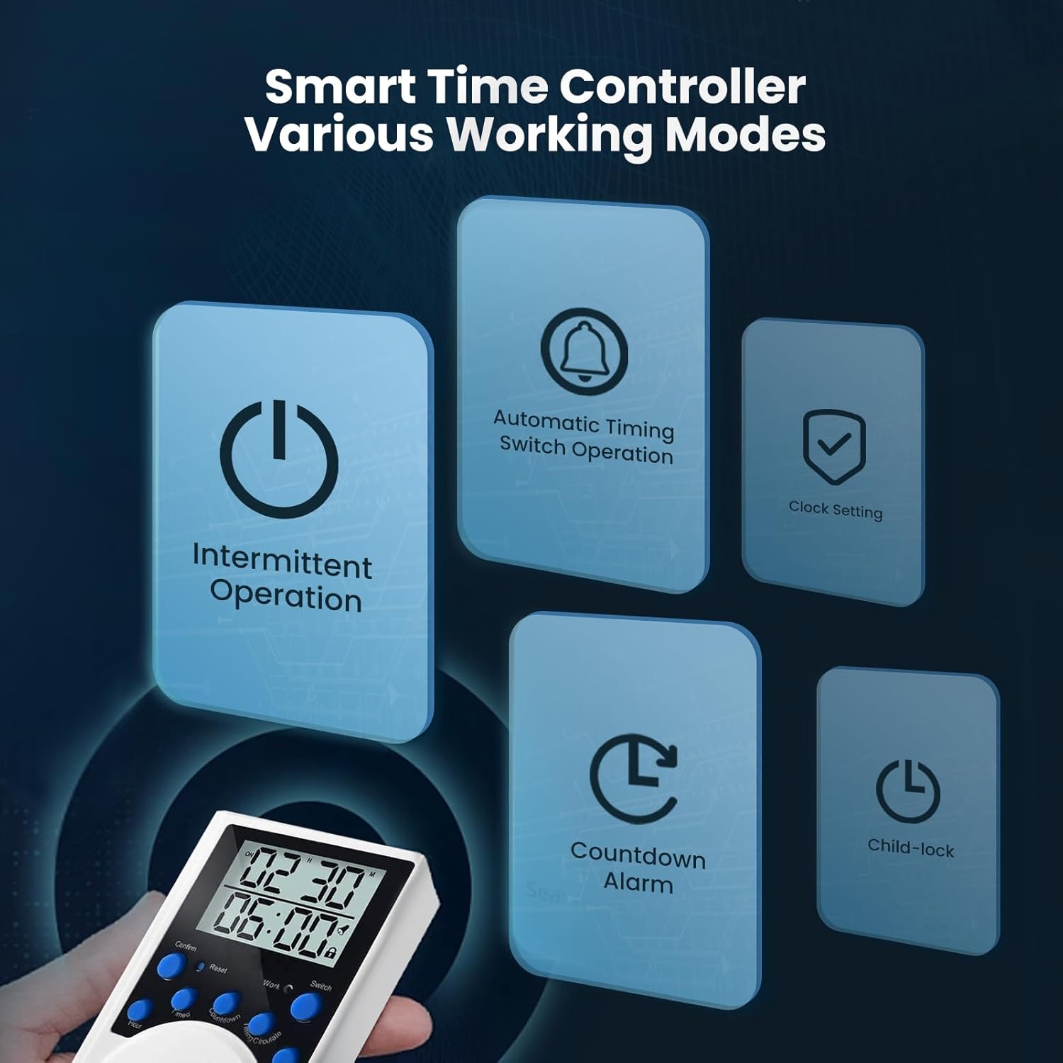 - Multiple Working Modes β Various timing functions could be set for energy efficient via the smart time controller such as automatic timing switch operation, countdown timer alarm, intermittent duty for the pond air pump aerator outdoor. The pond air pump could keep working without using the timer controller by manually turning on the switch after power on