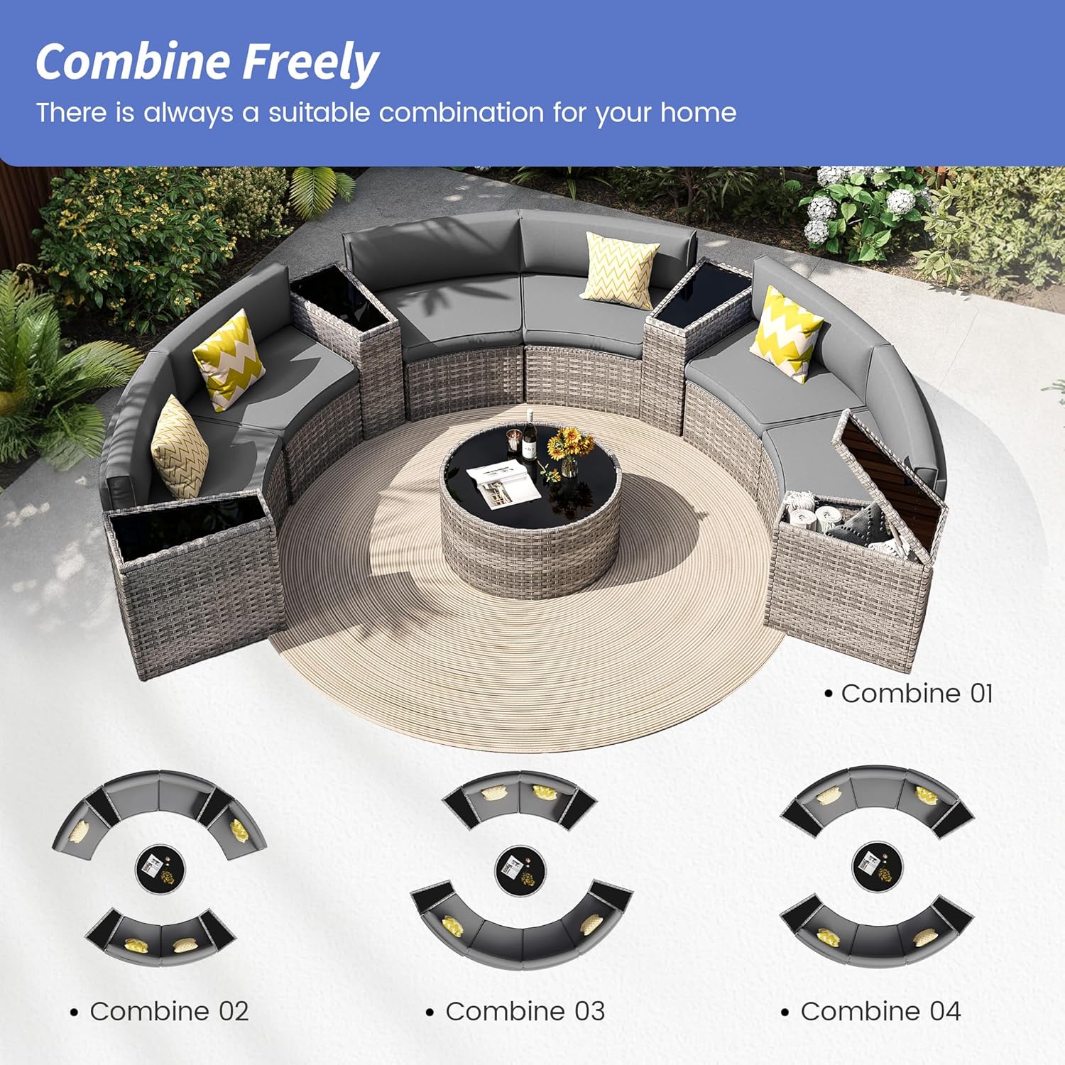 - Versatile Configuration: With the freedom to configure the half-moon outdoor sectional set according to your preferences, this set offers versatile seating options. Whether you prefer a left or right corner sofa, a semi-circular couch, or separate seating, our modular design can adapt to various spaces such as gardens, sunrooms, decks, swimming pools, or even indoor areas.