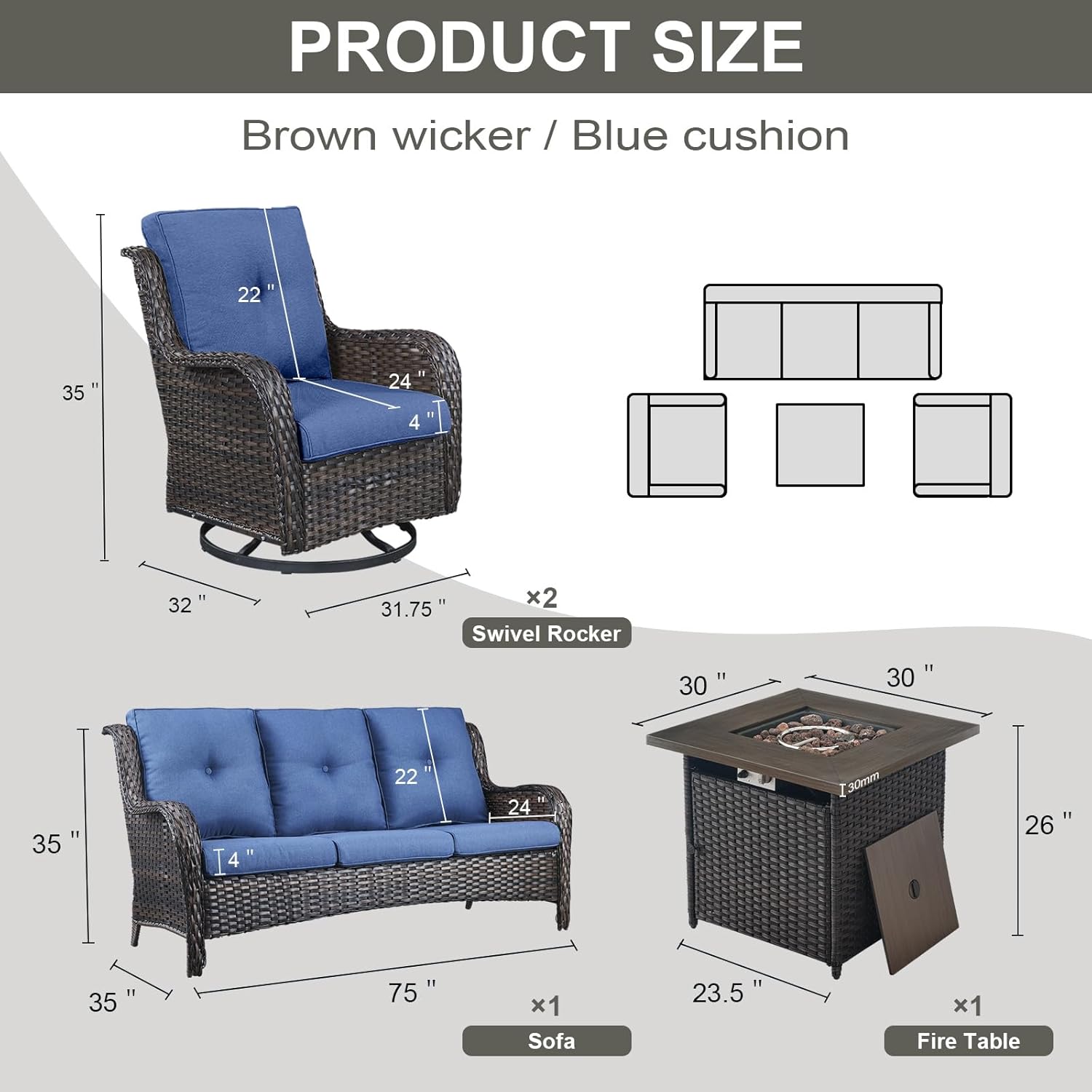 Outdoor Patio Furniture Set with 50000BTU Propane Fire Pit Table, 4 Pieces Wicker Patio Conversation Set with 2 Swivel Rocker Glider Chairs Rattan Sofa Blue Cushion Perfect for Gathering