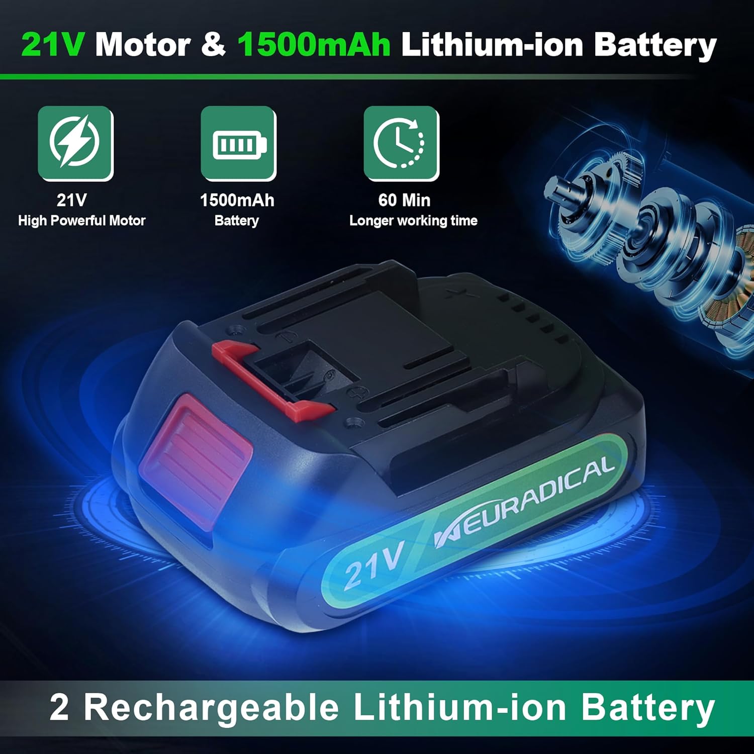 - 2.Provide 2pcs 1500mAh Rechargeable Lithium-ion Batteries: This electric cordless hedge trimmer is equipped with two 1500mAh high-capacity lithium-ion batteries, which can be used for up to 45-80 minutes. There is no need to worry about running out of battery, as you can simply replace one when it runs out and continue using the other, which is the benefit of having two batteries provided.