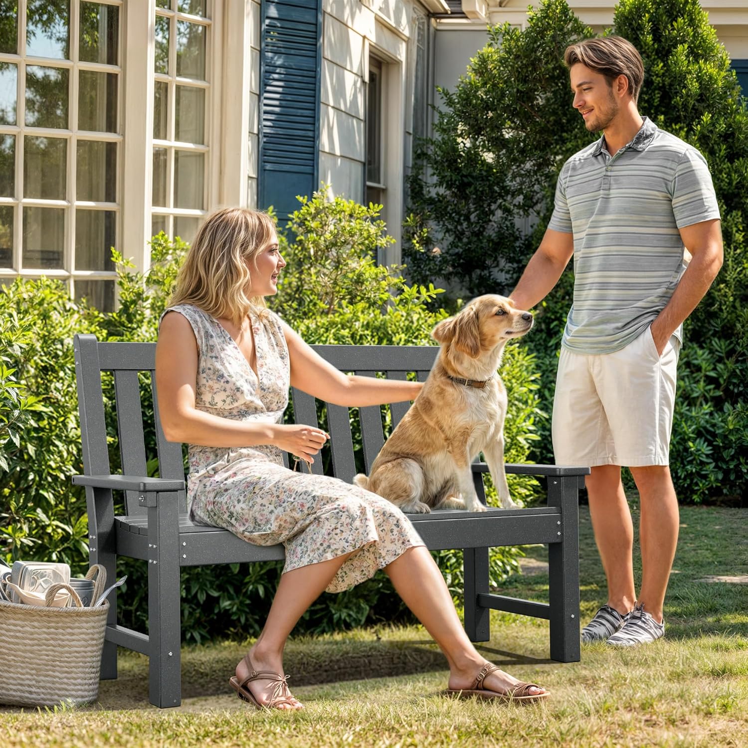 - Practical & versatile: With its faux wood grain design and simple, elegant style, this patio bench blends seamlessly into the scenery; Ideal for gardens, balconies, courtyards, and other outdoor spaces; Whether for resting, sightseeing, or chatting with friends and family, it provides a comfortable seating experience that achieves both form and function