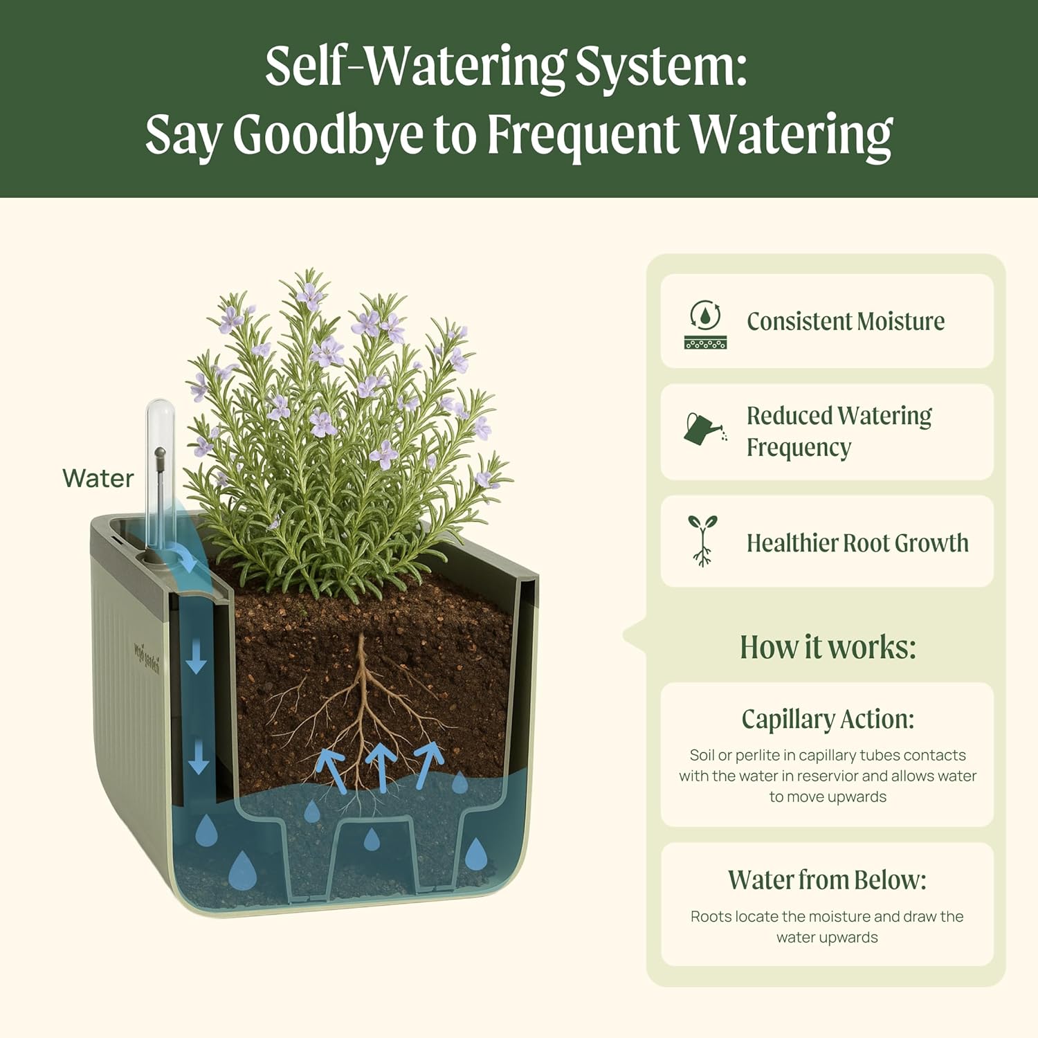- Innovative Watering System in Raised Garden Planter: A reliable and efficient solution for delivering water to your plants without having to worry about overflow. The water storage volume of the herb planter box is about 2.5L, fill it once to water your planter for up to 20 days! This innovative design gives new gardeners a hassle-free way to start growing in your room and desk!