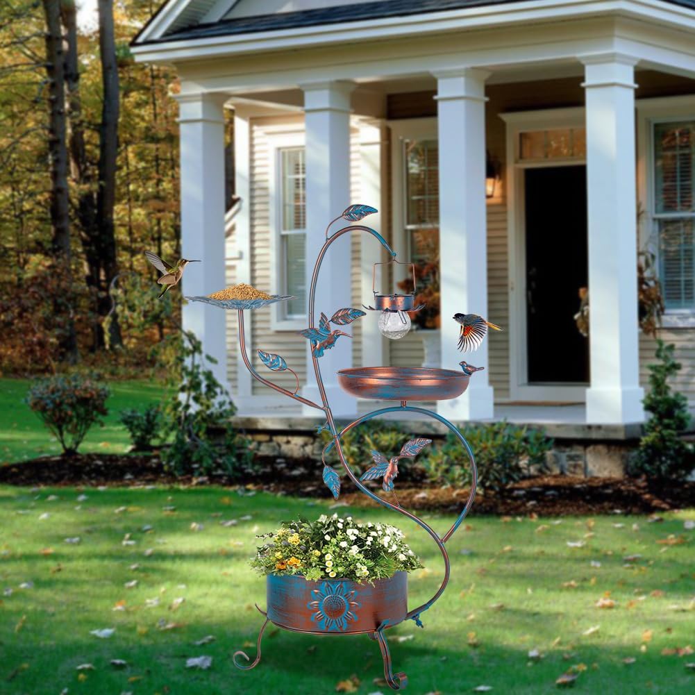 - 【3 in 1 Outdoor Bird Bath】This metal bird bath features a feeder, flowerpot & bathing area. The feeder entices birds to feed, while the flowerpot adds vibrant blooms, attracting more attention. The connecting part is like a vine, bending and stretching, full of natural breath.