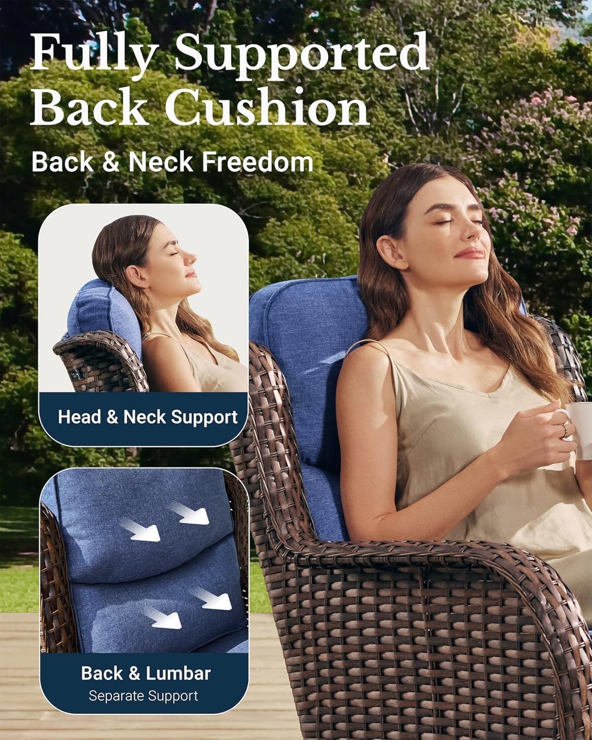 HILLGA Luxury Outdoor Swivel Rocker Patio Chairs of 2 with 6 Inch Thick Cushions and Side Table, Swivel Outdoor Chairs 3PCS High Back Wicker Patio Furniture Set for Porch, Balcony, Deck in Blue