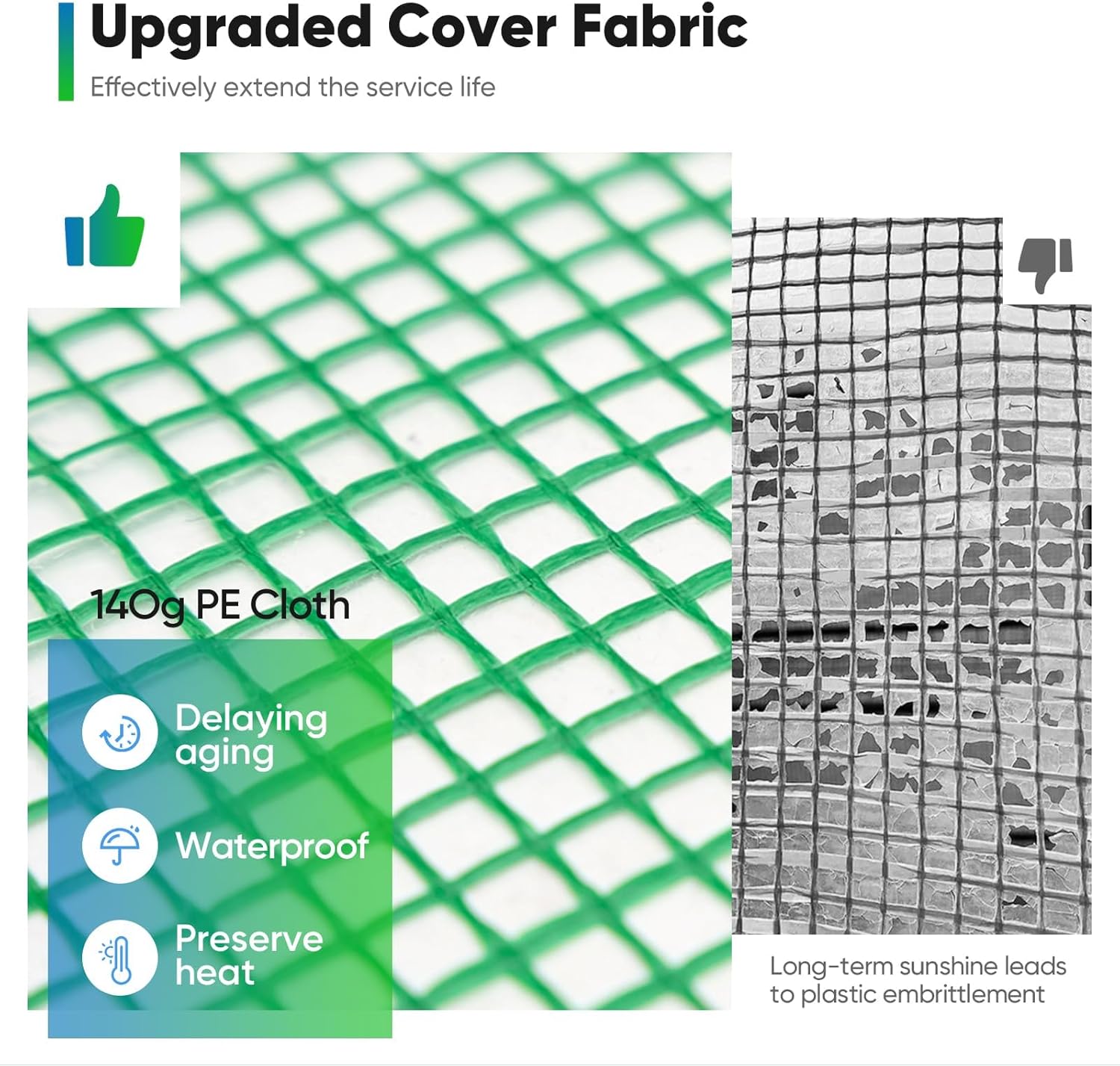 - UV Protected Durable Cover - Odorless waterproof PE cover meets the UVI level 6 standard, protecting plants from sun burnt. For PE Cover Edging design, you can put weights down to seal the bottom or just bury it in the soil for heat preservation, air tightness, humidity and temperature. 3-layer stitching cover can effectively avoid tearing during use.