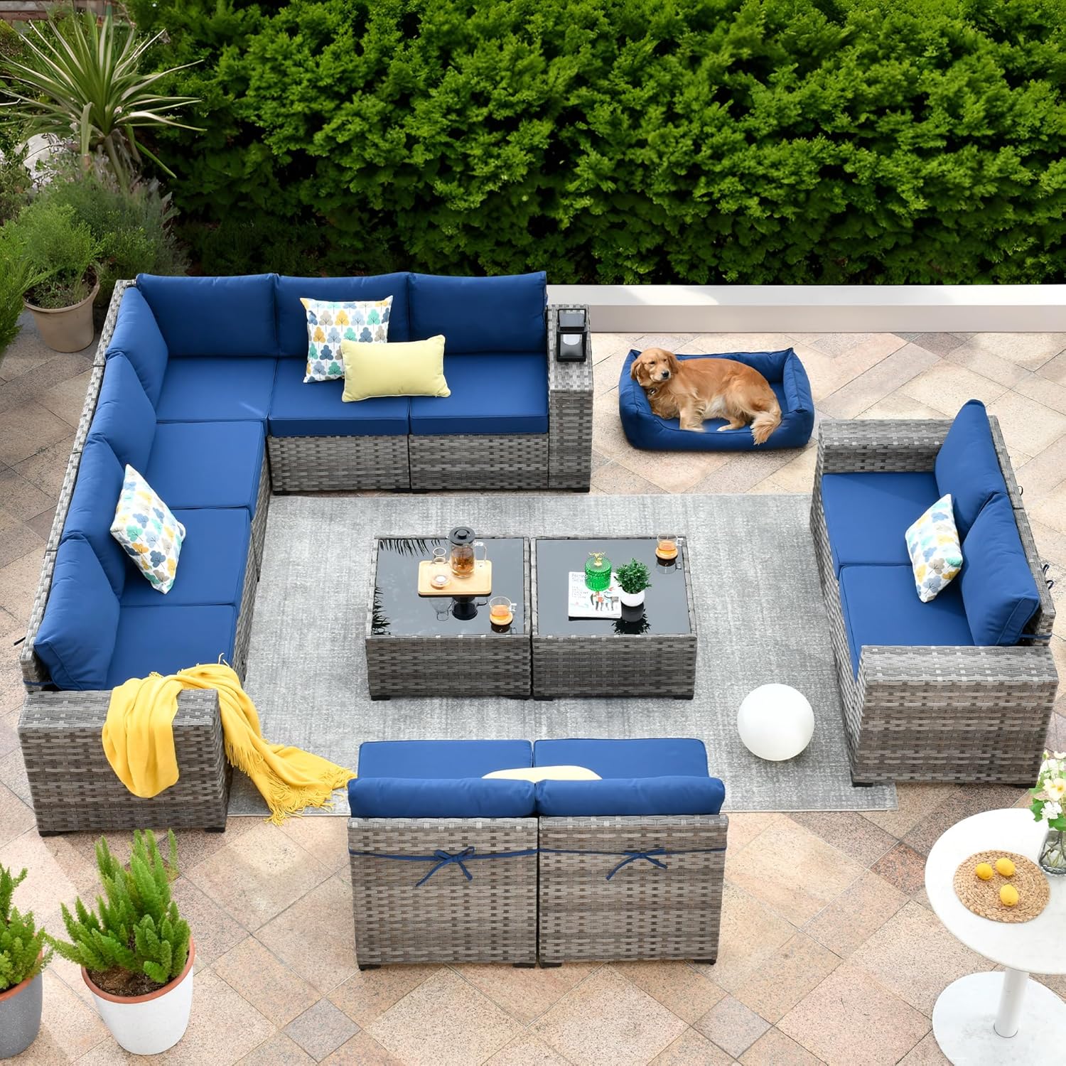 ovios 12 Pieces Patio Furniture Set, Outdoor Wicker Sectional Sofa with Glass Table Comfy Cushions, Modern Modular Deep Seat Couch Rattan Conversation Set, Navy Blue