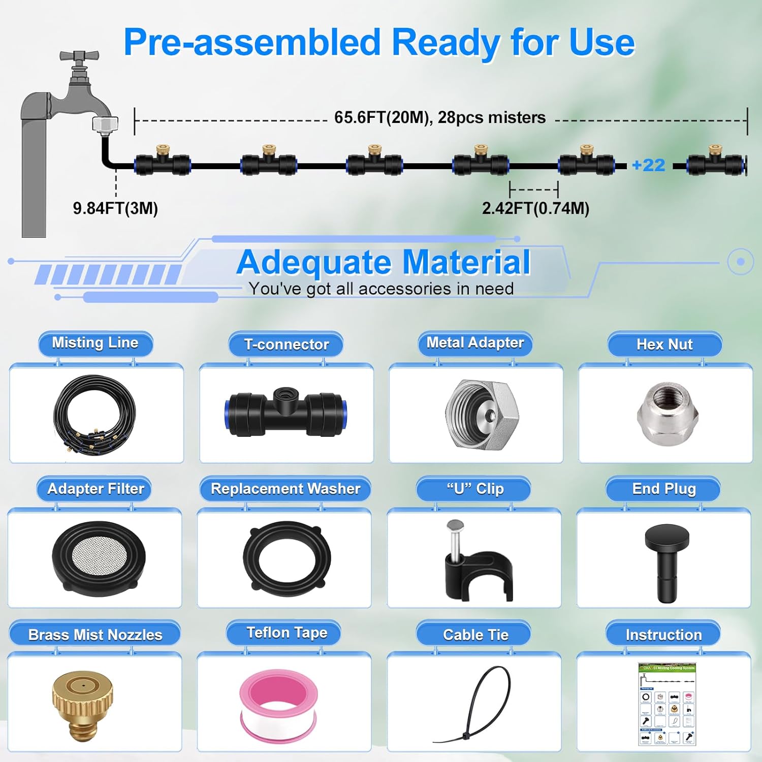 GOXAWEE Misting System, 75FT (23M) Misting Line + 28 Brass Mist Nozzles + Brass Adapter(3/4"), Misters for Outside Patio Cooling Outdoor Garden Greenhouse Trampoline for Waterpark
