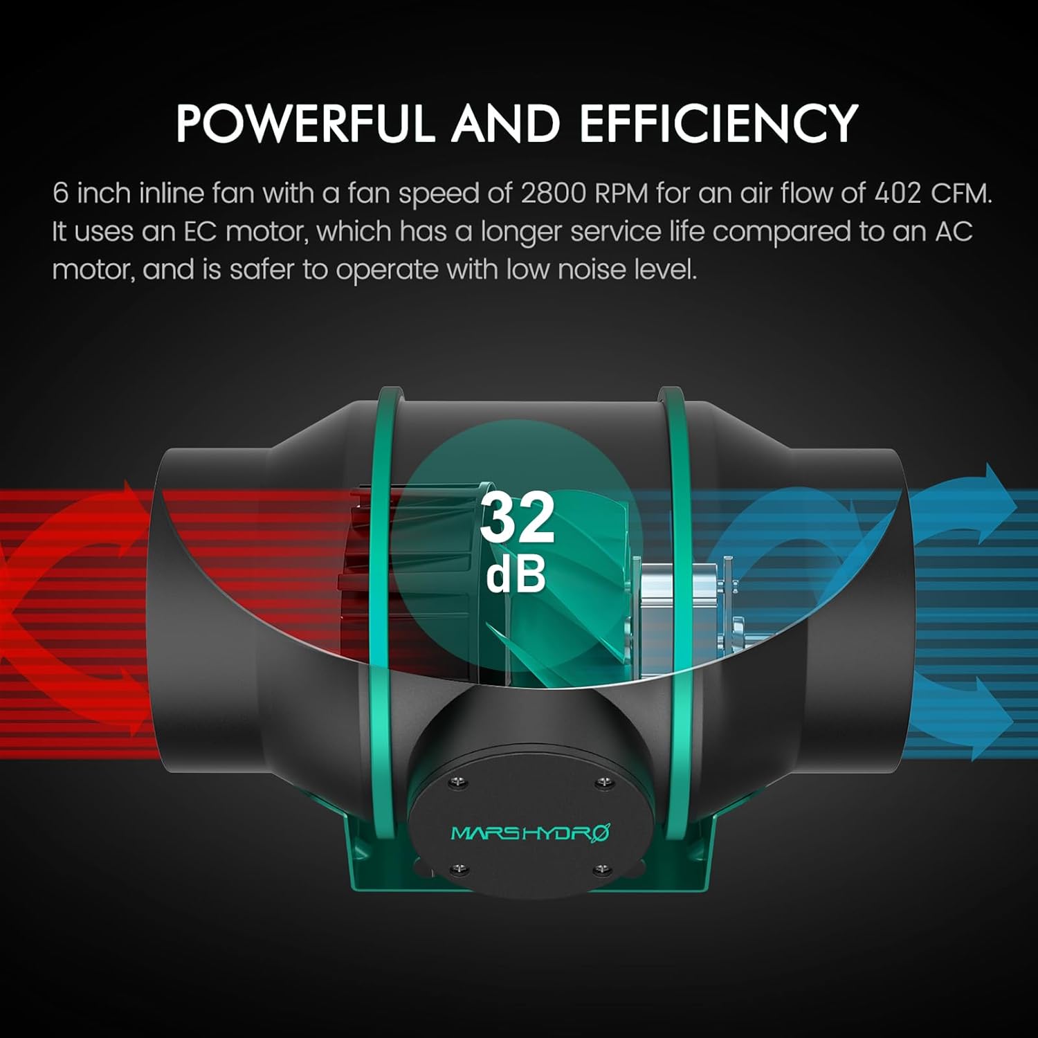 - 【402CFM ADJUSTABLE&EFFICIENT VENTILATION SYSTEM】The inline fan blades have a mixed flow design to provide active air to your growing space, the fan runs at 3000 RPM,adjustable speed from 0 to 100%,and provides 402CFM of airflow. Only 32 dB noise. 1050+ RC 48 Australian Virgin Charcoal with 25ft length flex ducting,effectively filters impurities and odors from the air.