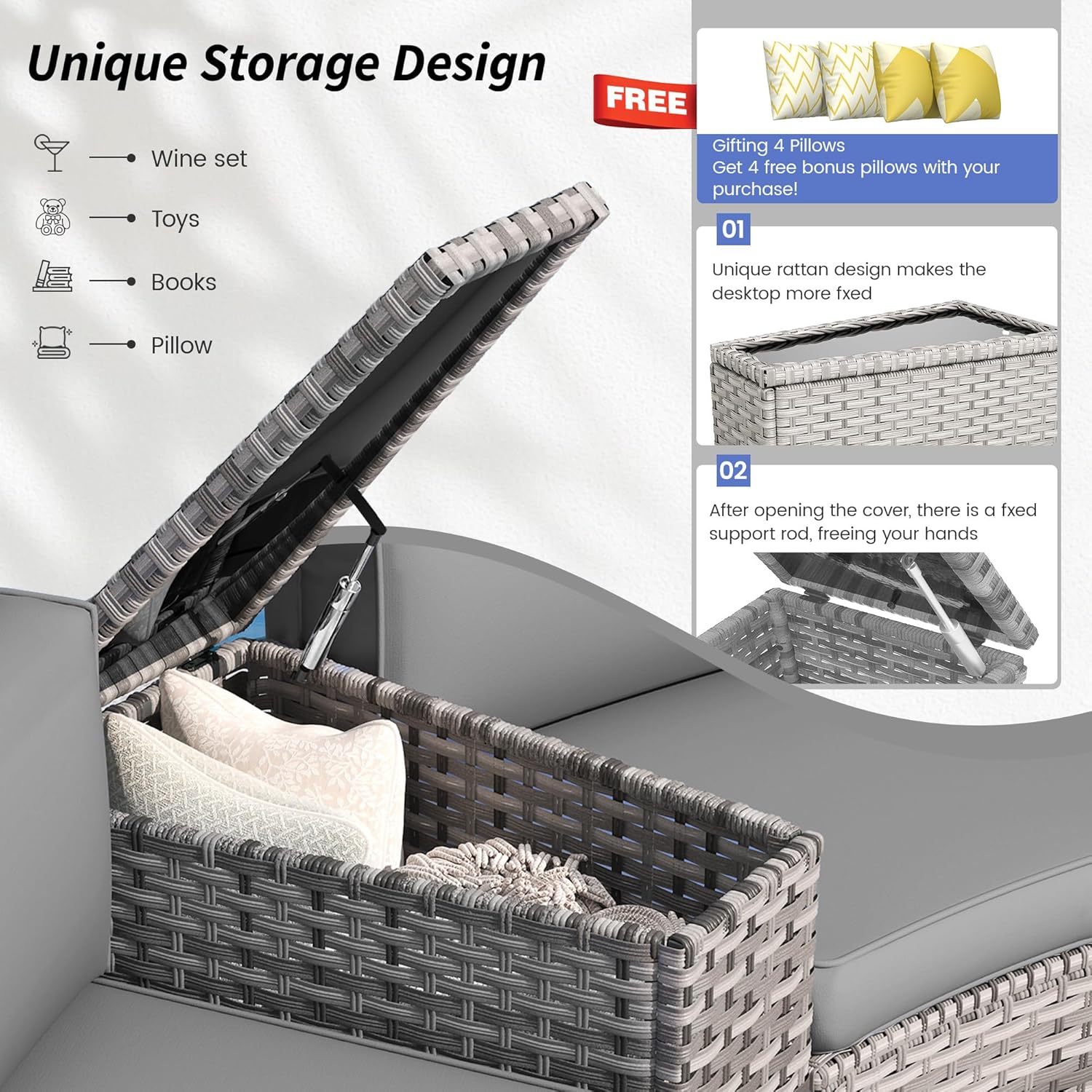 Patio Sectional Furniture Outdoor 8-Piece Grey Rattan Curved Sofa Set with Fire Pit Table,Storage Table,Pillows,Fit for Pool Backyard Balcony Porch Lawn (Grey)