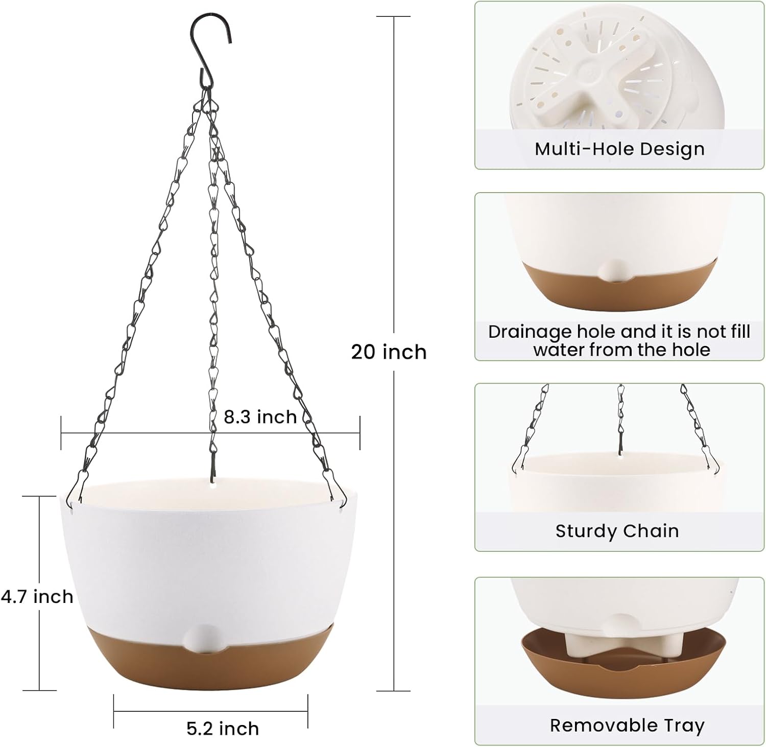 8.3 Inch Hanging Planter, 3 Pack Hanging Plastic Plant Self Watering Pot with Drainage Holes and Saucers, Hanging Baskets Flower Pots for Indoor Outdoor Garden Plants and Flowers-White