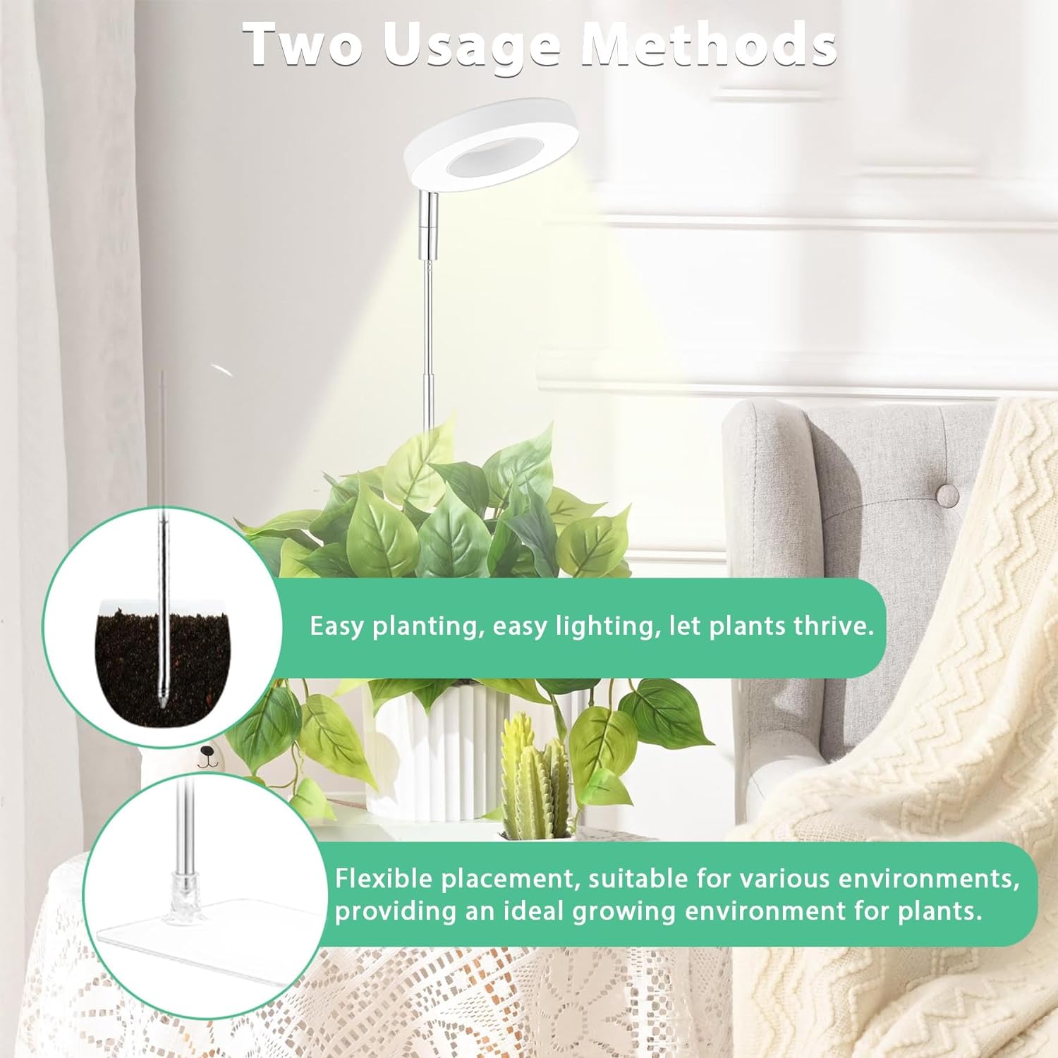 - Desk Grow Light for Home Garden Lighting Solution: This plant grow light comes with a detachable base, it has 2 use methods: 1. Base method ; 2. Insert into the soil directly. perfect solution for office desk,living room, dark corner in house,doesn’t take up valuable space, they just fit in with decor.Halo light design to help your plants grow happier and healtier!