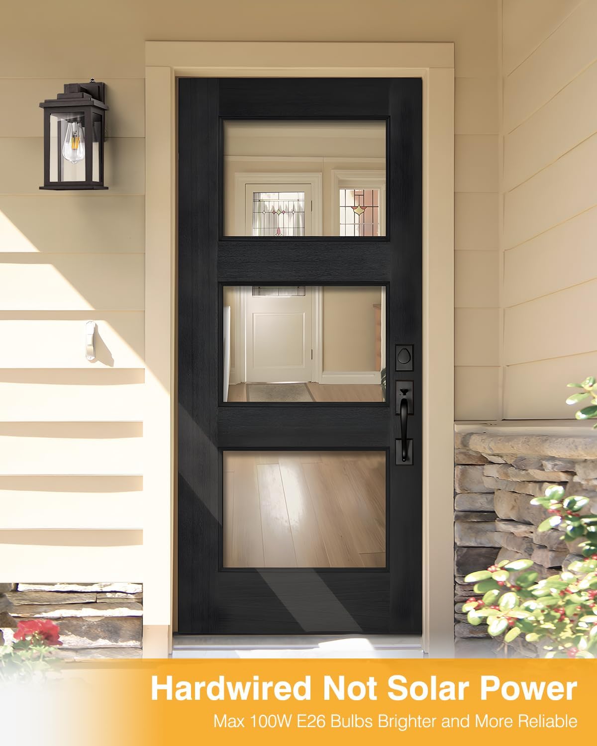 - 🌞【Quick to Install & E26 Bulb Compatibility】Installing our outdoor wall sconce is quick and hassle-free as it arrives fully assembled. It is UL-listed, guaranteeing both exceptional quality and safe operation for you and your loved ones. For the best lighting experience, we recommend using E26 bulbs, including LED or CFL lamps, to eliminate any potential flickering issues. (Bulb not included)