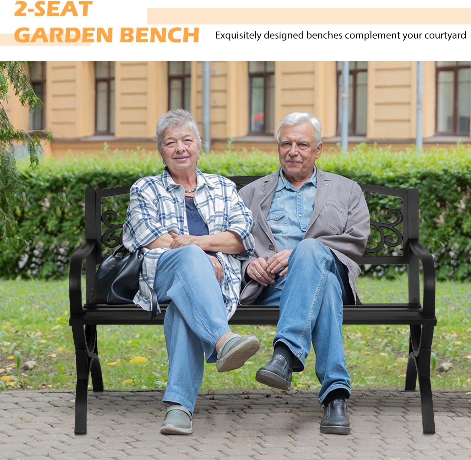 - Great Details : Every edge of the Garden Bench is meticulously finished, eliminating raw cuts or drips that could catch on clothing. Delicate patterns adorn the back of the park bench, and plastic spraying protects every part, minimizing the possibility of rust.