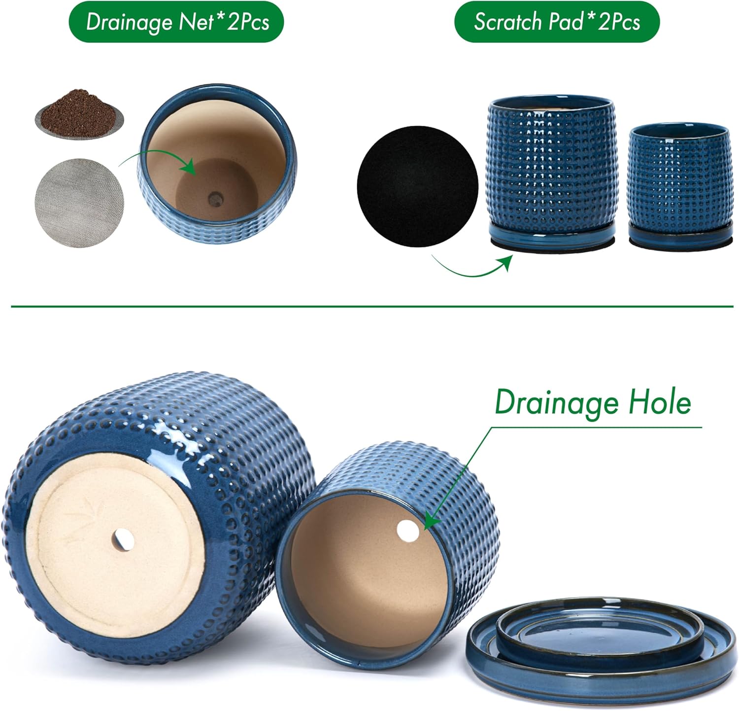 D'vine Dev 6 Inch 4 Inch Ceramic Indoor Planter Pots with Drainage Hole and Saucer, Beaded Design Flower Pots, Set of 2, Blue, 27-D-U-3