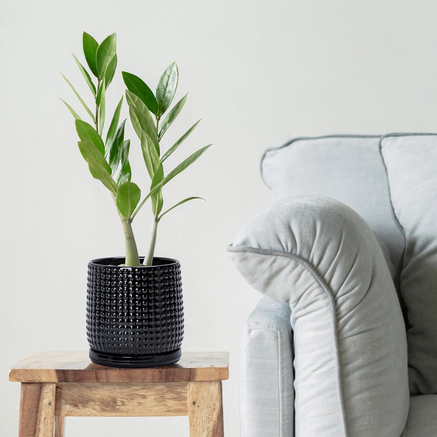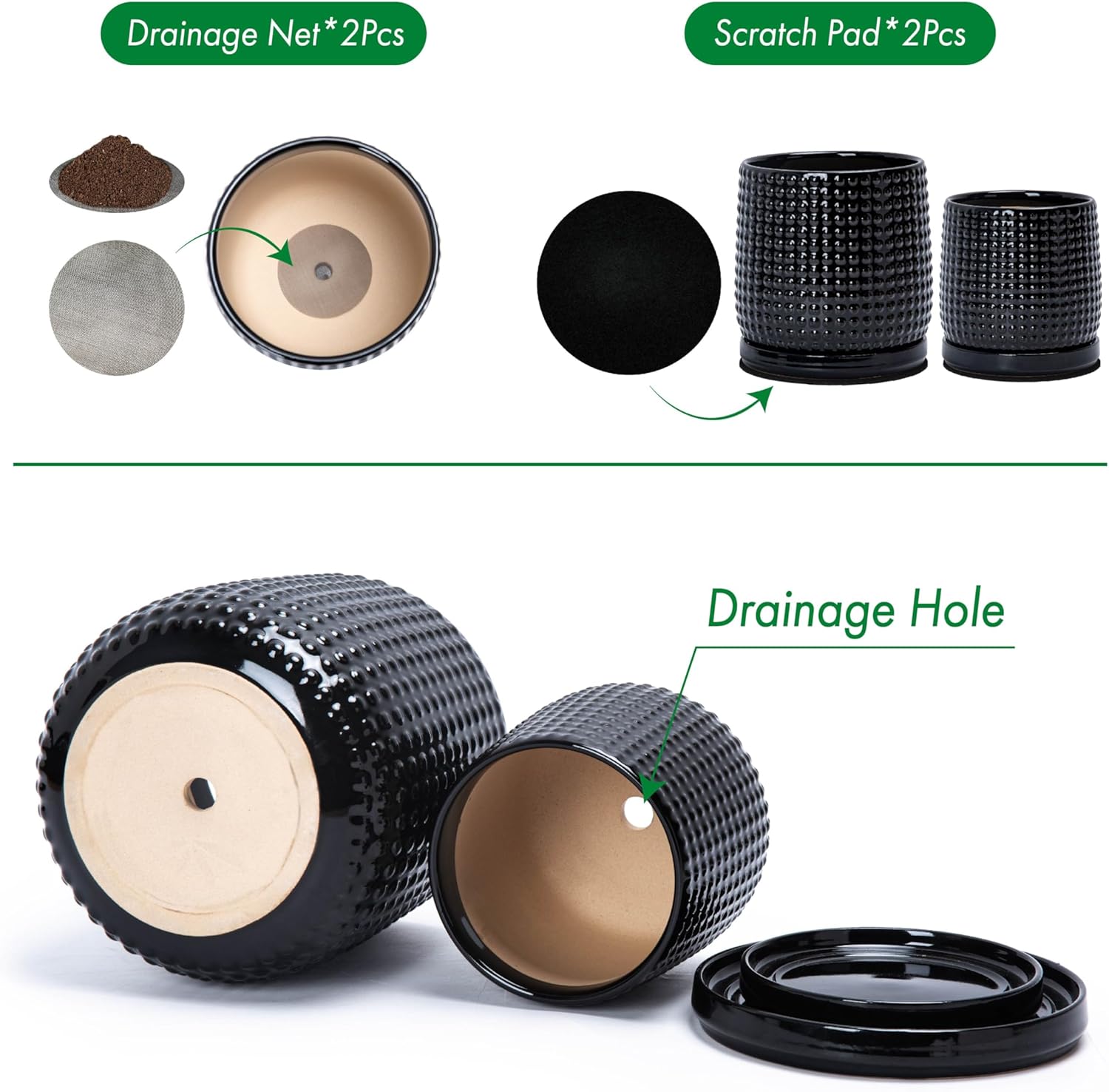 D'vine Dev 6 Inch 4 Inch Ceramic Indoor Planter Pots with Drainage Hole and Saucer, Beaded Design Flower Pots, Set of 2, Gloss Black, 27-D-U-2