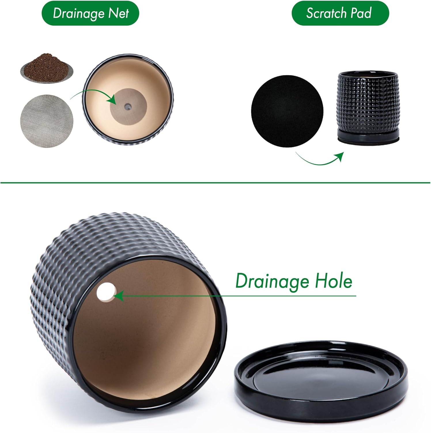 D'vine Dev 4 Inch Ceramic Beaded Stoneware Planter Pot - Flower Pot with Drainage Holes and Saucers for Indoor Succulent Plants or Flowers, Glossy Black, 27-C-Z-2