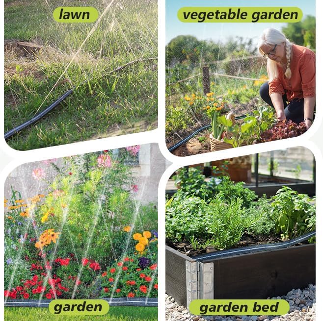 - Versatile Watering Solution: Designed for flexibility and versatility, this sprinkler hose is your go-to tool for watering new sod, gardens, shrubs, or any tight plant space, providing adaptable and efficient watering. With just one sprinkler hose, meet all your watering needs effortlessly.