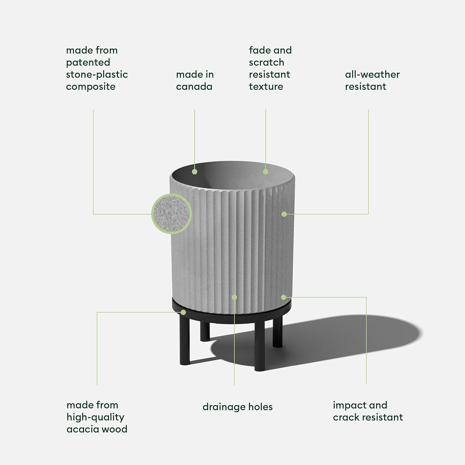 - DURABLE MATERIAL: Made from a patented plastic-stone composite, this fluted planter has a subtle textured finish and is all-weather resistant to cracks, scratches, UV and fading; perfect for hot or cold climates ranging from -20 to +120 degrees