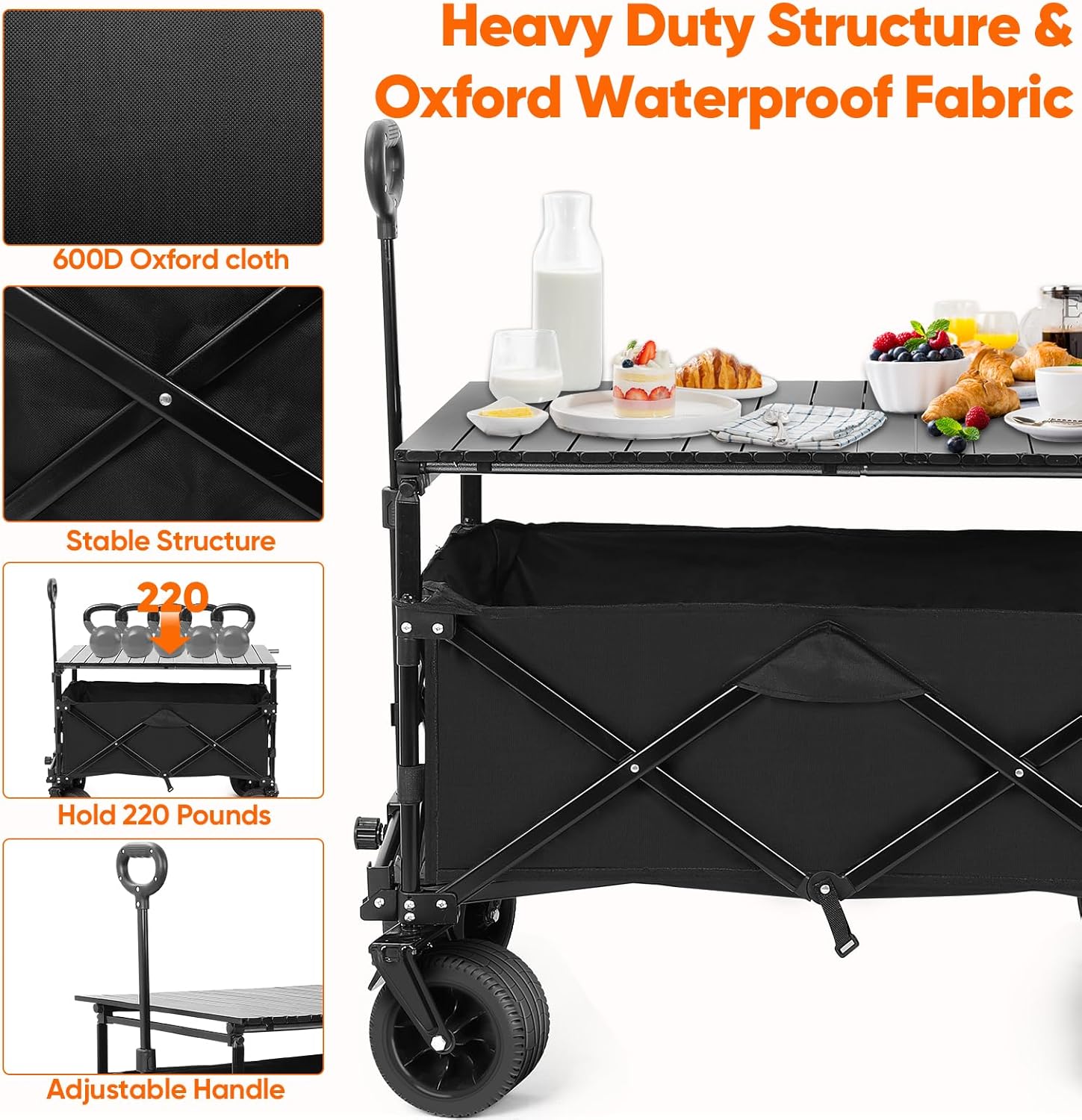 - 【Removable Tabletop】This heavy-duty beach wagon comes with a foldable tabletop, as a tabletop for your outdoor camping trips to hold mugs, food, beverages, and more. When not needed, just remove the table and retract all four horizontal poles, fold up the tabletop, and place it in the wagon cart