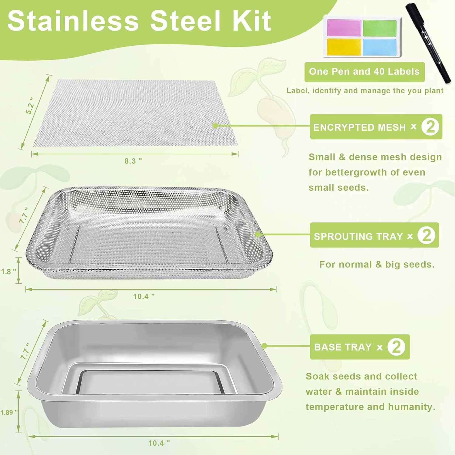 - Sprouting Tray Kit 2 Set: TCYPUHL Seed Trays Kit includes a 2-tier stainless steel seed sprouting kit. Each tier consists of two area of 10.4 " by 7.7 " sprouting trays, along with instructions and two stainless steel filters equipped with three encrypted mesh layers. Ideal for beans, broccoli sprouts, alfalfa seeds, wheatgrass, and more.