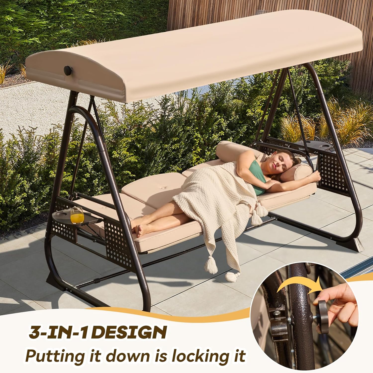 - ăConvertible 3 in 1 Bed Designă: Enjoy life with our 3 seat porch swing designed for ultimate comfort and adaptability. The swing outdoor provides 3 gear adjustment for different activities. The patio swing chair could be turned into a porch swing bed in seconds. with 3 position backrest ensures you find the suitable lounging angle. Whether chatting, swinging, or napping, this porch swing bed meets your need.