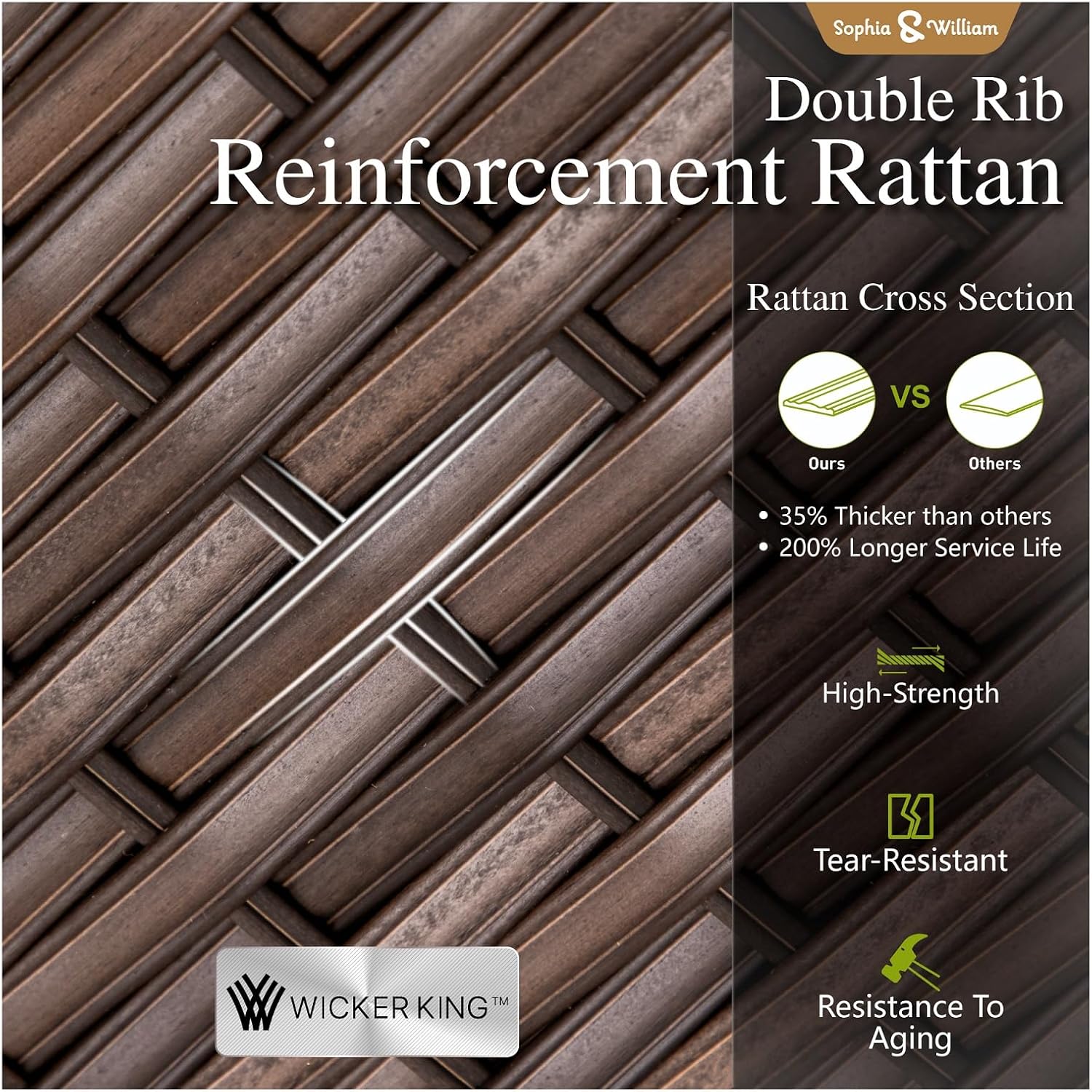 - LUXURIOUS COMFORT & ALL WEATHER USE: Constructed from allweather hand woven rattan wicker and rustproof steel frame. Sofa cushions are made of patent CUSHION PRO technology fabric which has excellent water resistant, oil-release, and stain resistant properties, ensure that youll be able to enjoy your set for many seasons to come. Its 4-inch thick cushions and spacious seating area provide a perfect balance of softness and support, allowing you to relax for hours